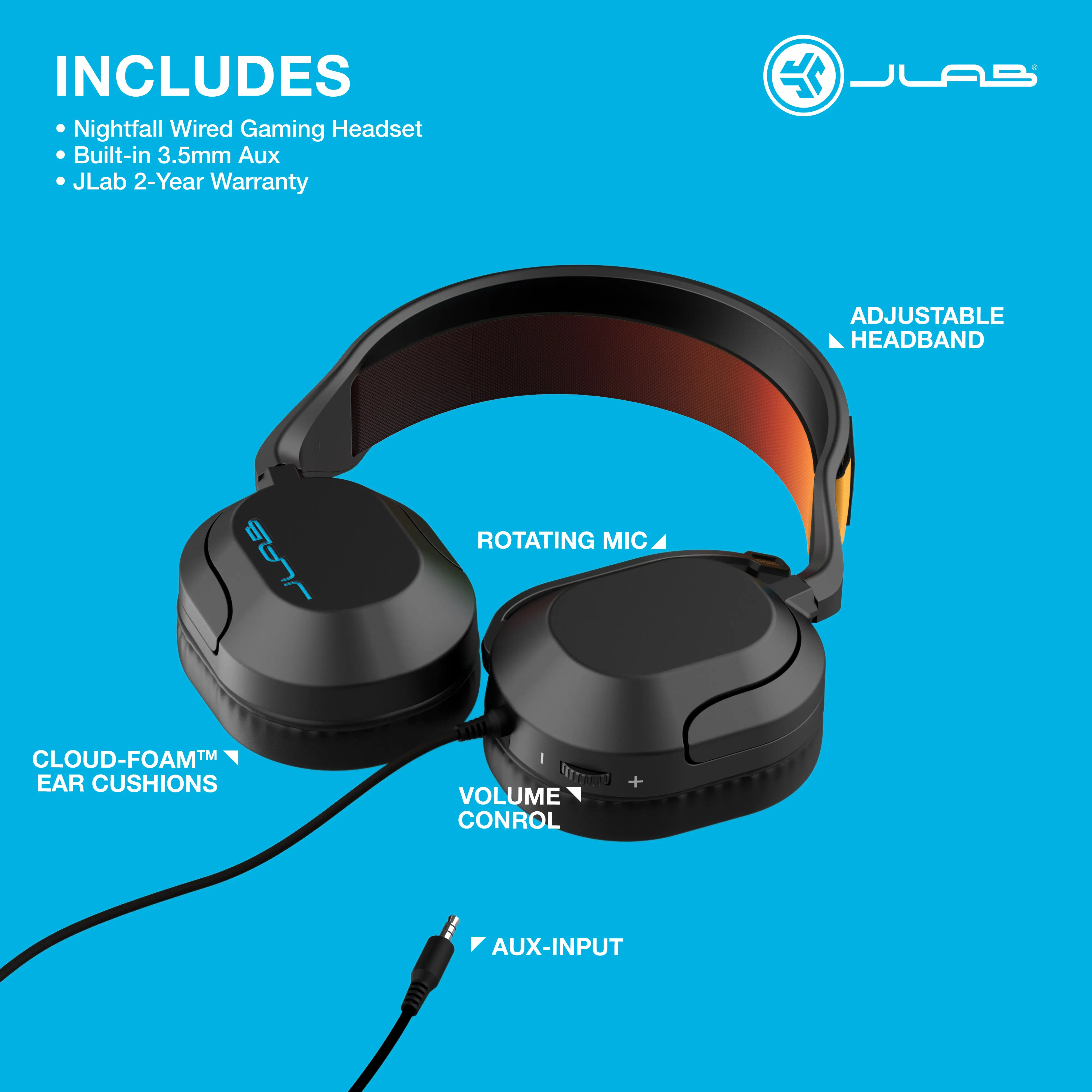 Includes: Nightfall Wired Headset, Reversible Color Headband, and JLab 2 Year Limited Warranty