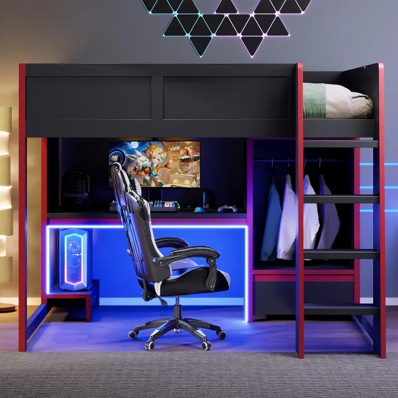 The Bellemave Wood Twin/Full Size Gaming Loft Bed is a space-saving and multi-function solution for your bedroom. It includes a desk, drawer, wardrobe, and LED lighting, providing ample storage and a sturdy wood frame for safety and stability. No additional box spring or foundation is required.