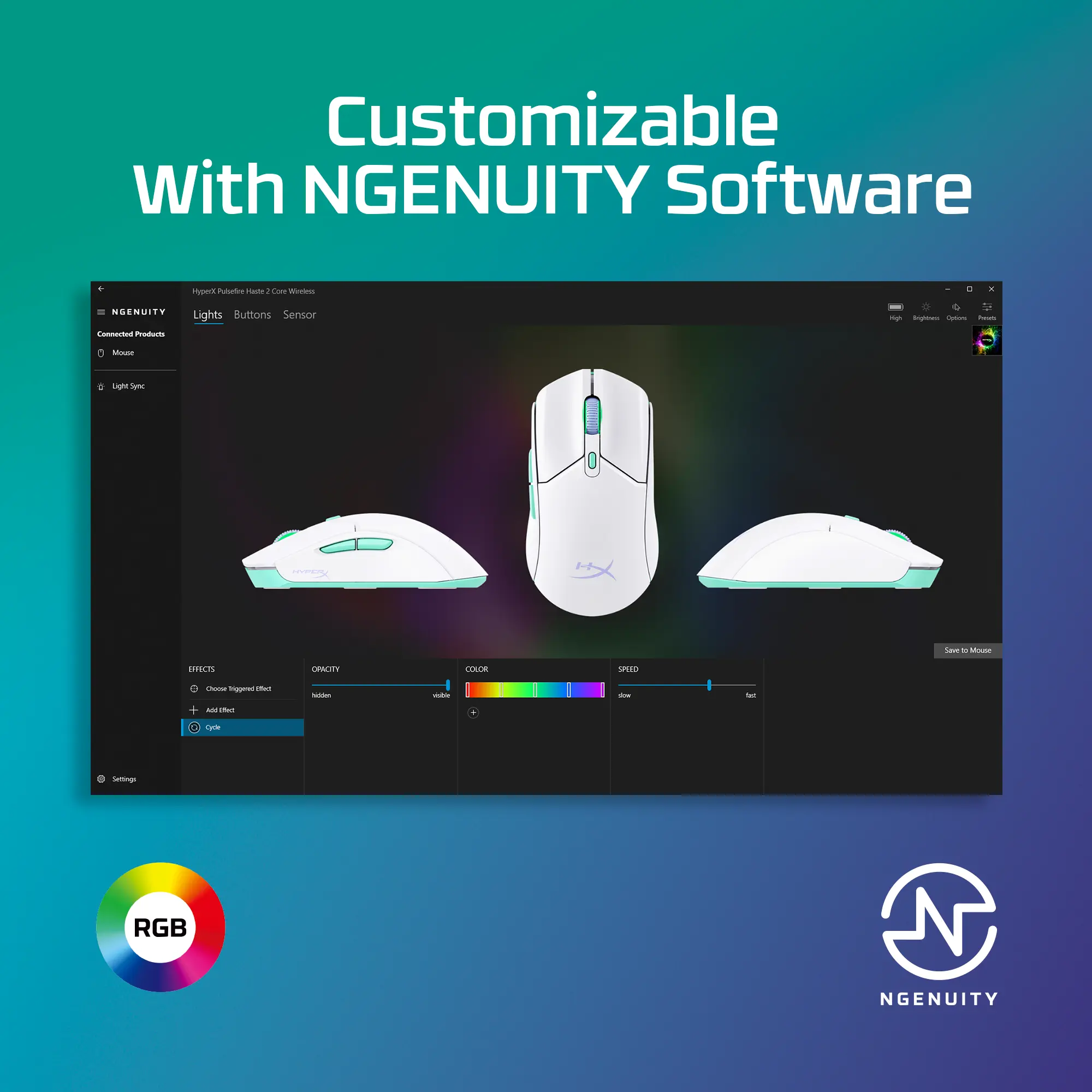 Personalize lighting, set up macros and or key binds, and customize DPI settings with easy-to-use HyperX NGENUITY Software5 and get the most out of the Pulsefire Haste 2 Core Wireless.