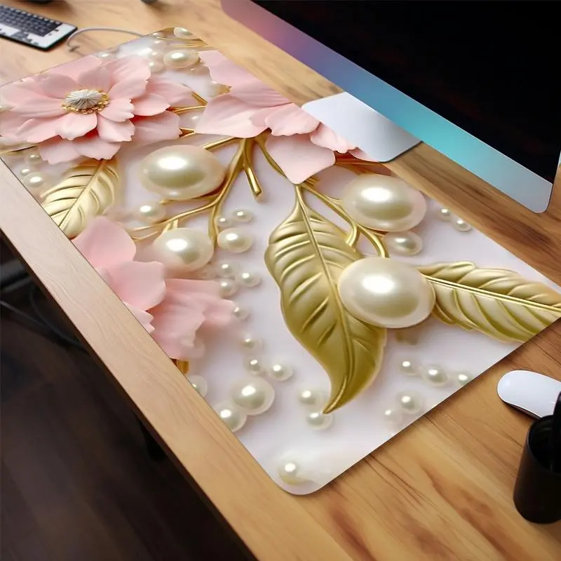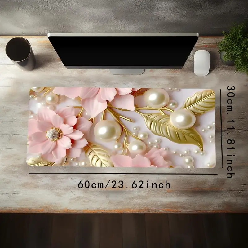 Floral Pearl Pattern Mouse Pad, Aesthetic Painting Large Gaming Mouse Pad, Office Desk Accessories, Desktop Accessory, Non-slip Rubber Base Stitched Edge Desk Pad for Home Office Game, Pastel Color