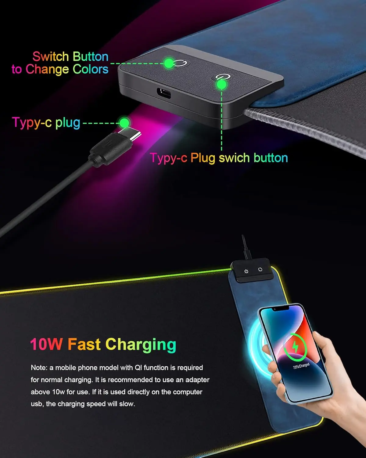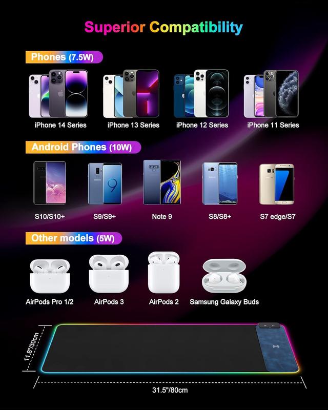 ·Wireless Charging: Conveniently charge your devices without the hassle of cables, making it perfect for gaming and other activities.