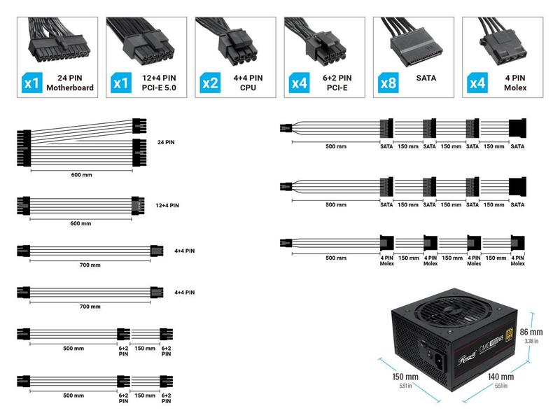 Rosewill CMG5 1000W, ATX 3.0 & 3.1 Compatible, 80+ Gold 1000W Full Modular Power Supply, PCIe 5.0 600W 12V-2x6 Connector, 100% Japanese Capacitors, 120mm FDB Fans - CMG1000G5