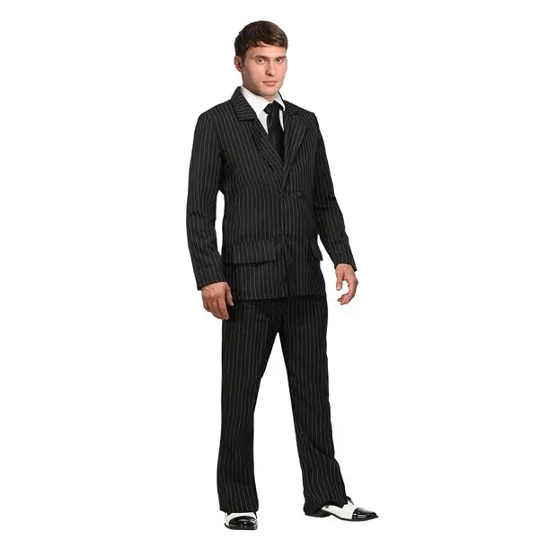 The suit is made from polyester material, and features a pin-striped double breasted jacket with four buttons and two faux pockets. The pin-striped pants have an elastic waist. Be sure to add a tommy gun and oxford shoes to complete this retro gangster look this Halloween!