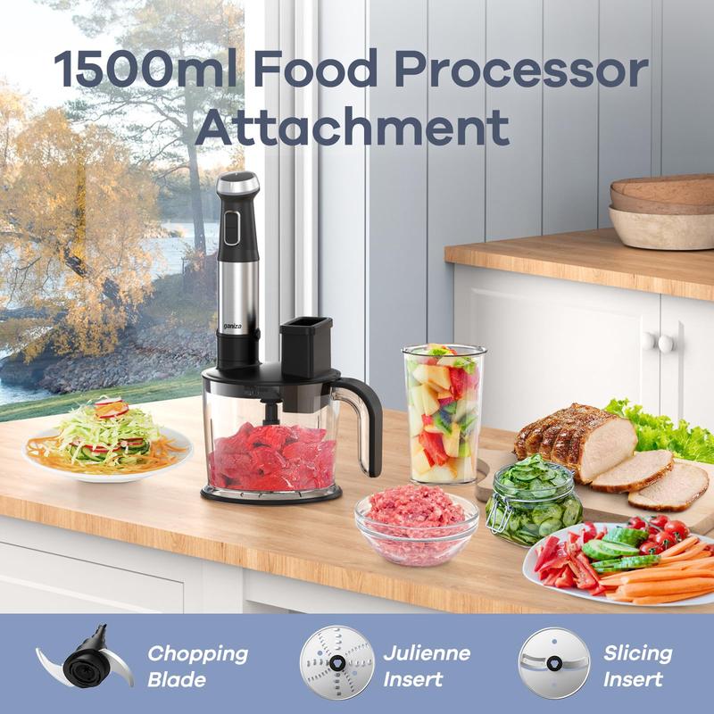 ·Includes: Handheld blender, 800ml mixing beaker, 1500ml chopper, julienne insert, slicing insert, whisk, and milk frother.