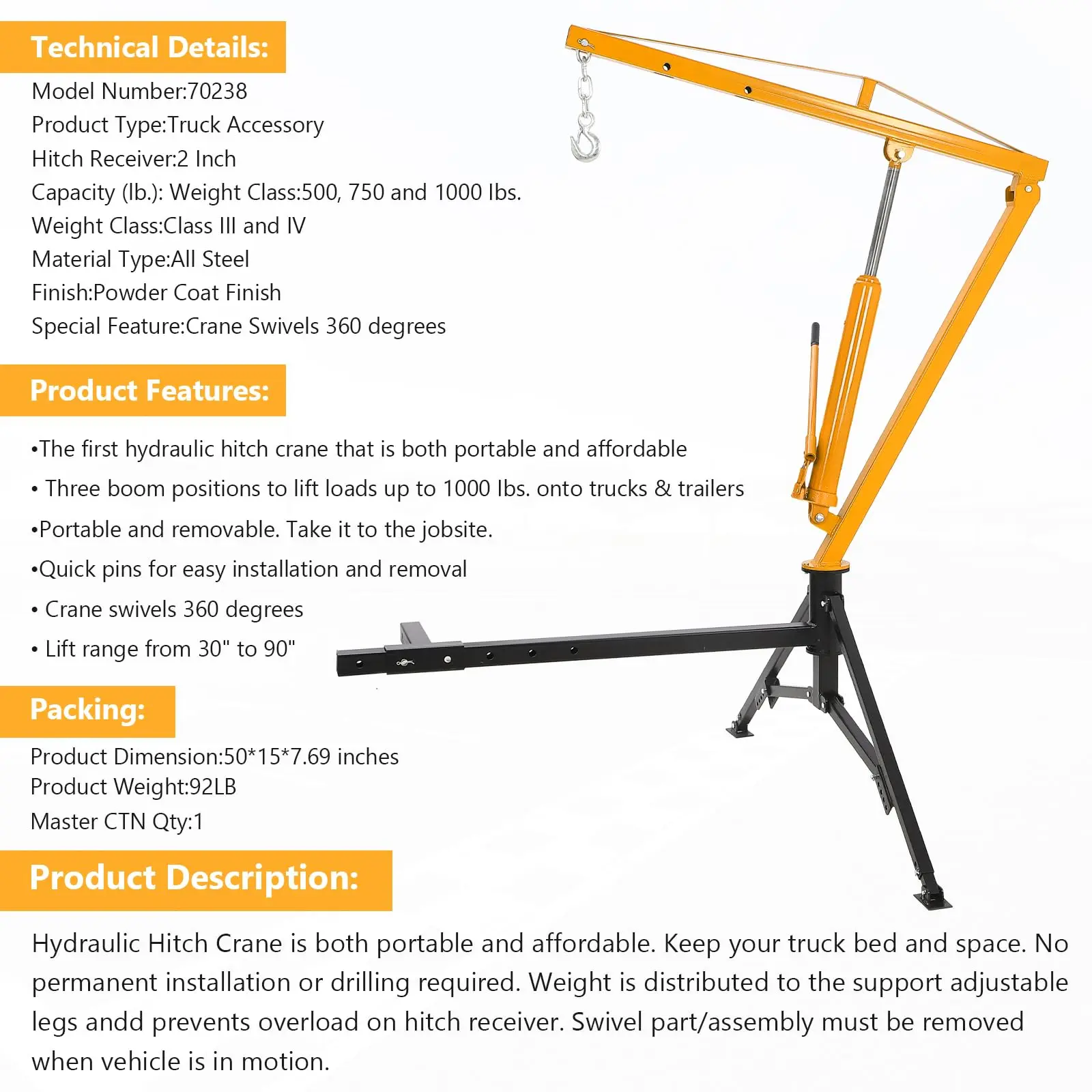 Powerful 1000Lb Hydraulic Lifting Capacity: This hydraulic pickup truck crane hoist supports boom capacities of 500, 750, and 1000 lbs, perfect for heavy-duty lifting. Ideal for workshops, construction, or a deer hoist for truck hitch, it handles engines, barrels, and more with ease