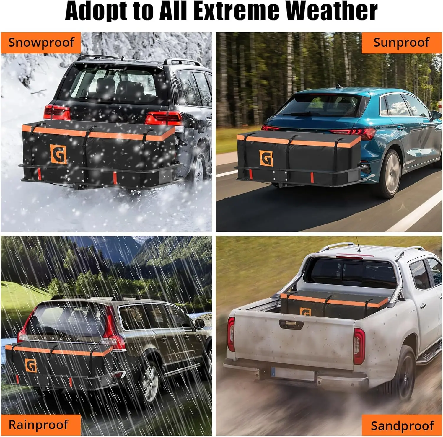 ·【Superior Weather Resistance】Crafted from durable PVC tarpaulin, this trailer hitch cargo carrier features welded seams and a velcro flap design, making it completely weatherproof. No matter the conditions, your belongings will be shielded from rain, snow, wind, sun, dust, and road grime, providing peace of mind on any journey.
