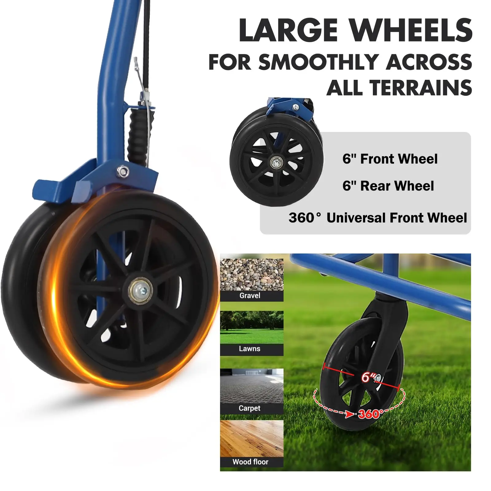 Perfect Outdoor Rollator Walkers: 6-inch solid explosion-proof tires, 360° rotation, non-slip, wear-resistant, with good shock absorption, easy to maneuver on grass, gravel, dirt and gaps in sidewalks