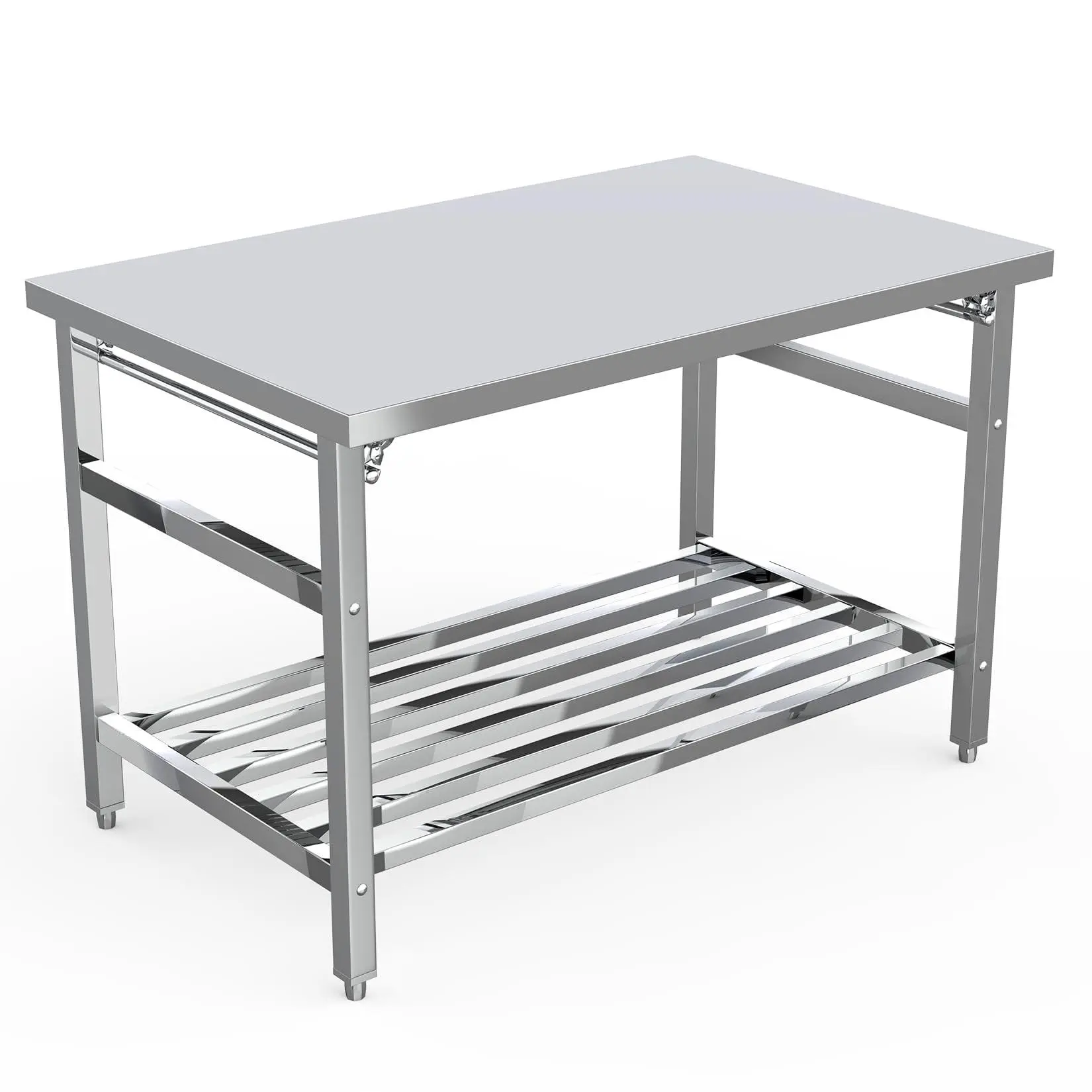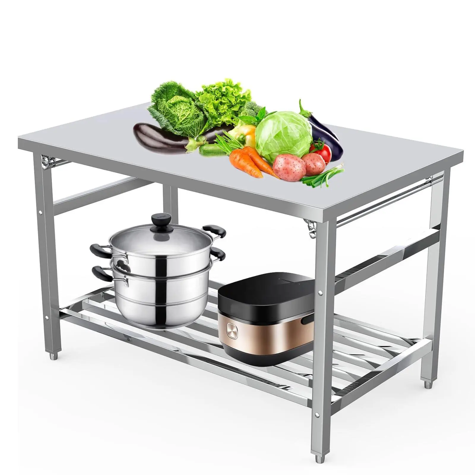 【Strong and Stable】--The stainless steel prep table is supported by legs with a 1.5-inch diameter and thickened folding hinge, effectively keeping the table stable during use. Adjustable feet with a non-slip mat provide more stability. Ideal for meal prep, baking stations, or garage workbenches.
