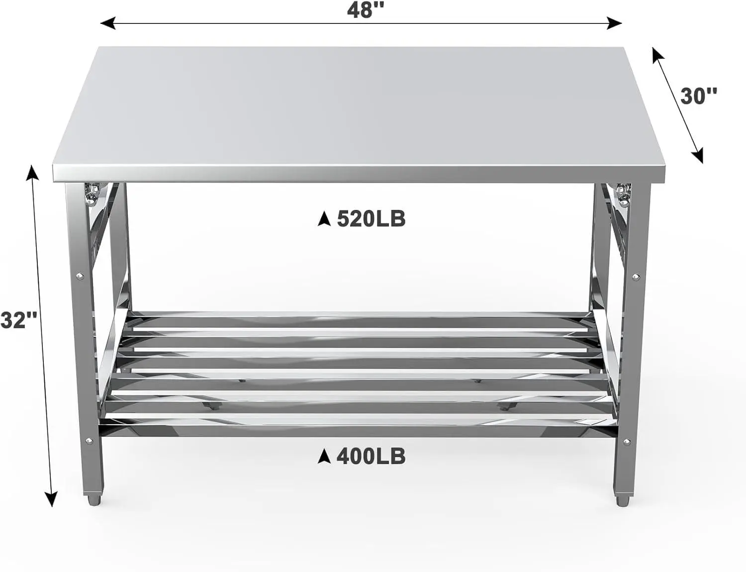 【Adjustable Undershelf】--The height-adjustable bottom shelf (supports 400 lbs) adapts to store microwaves, mixers, or kitchen tools, while the 520lbs capacity tabletop handles bulky equipment. The 4 legs can also be adjusted slightly in height. Ensure that uneven ground can also be used normally.