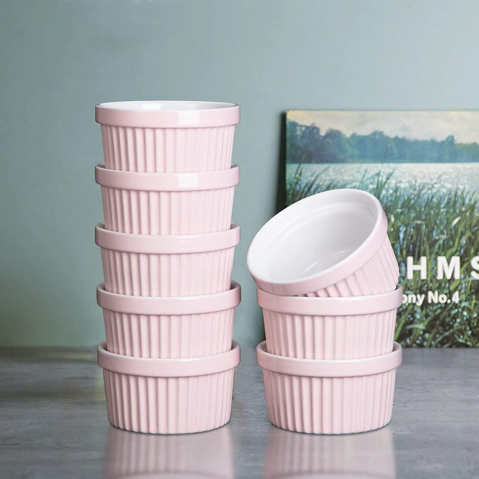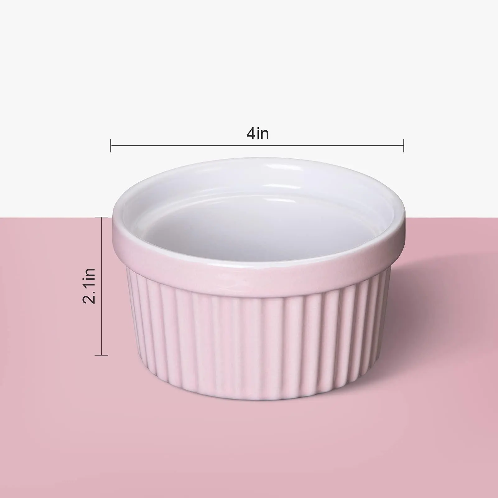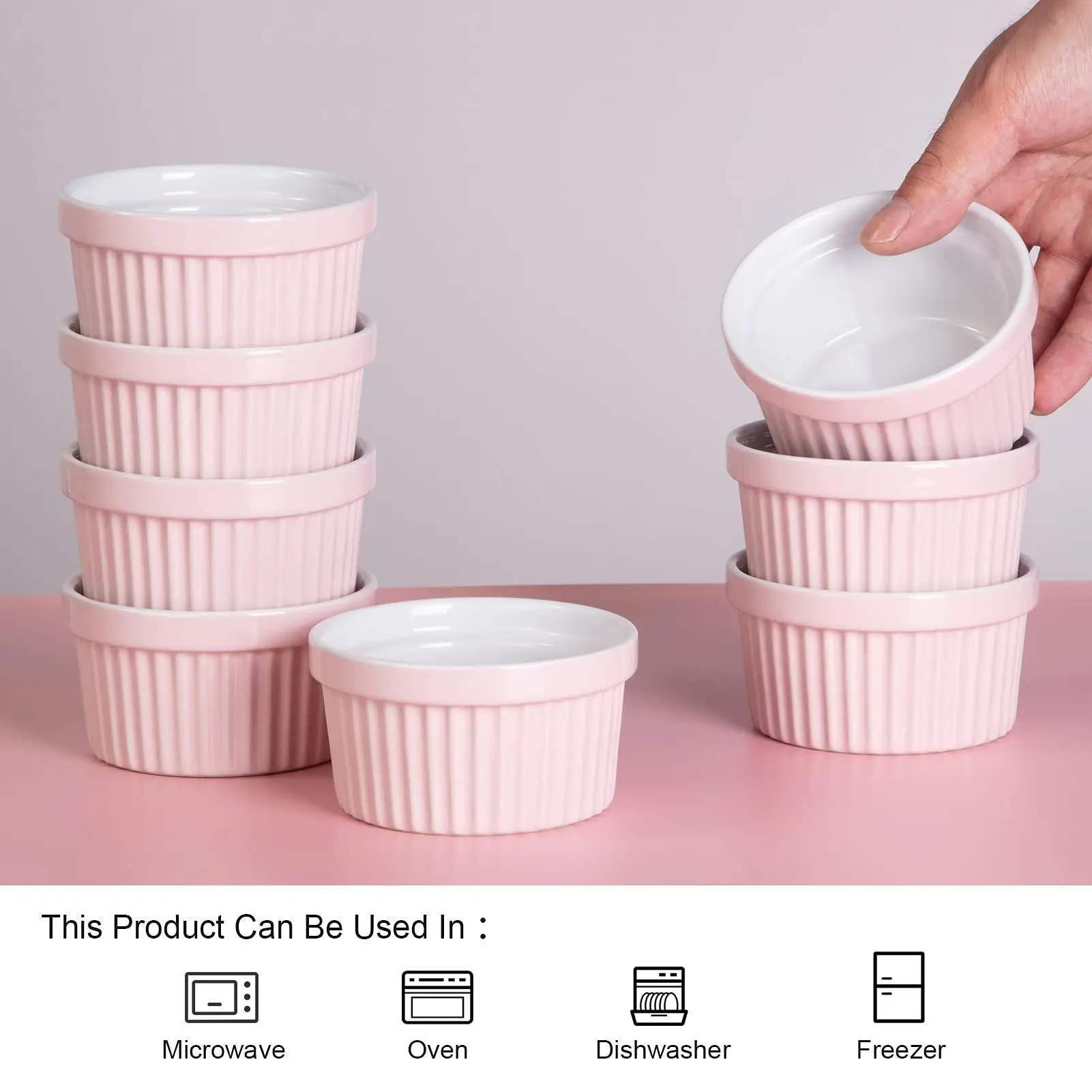 5. 8 oz Ceramic Ramekins, Set of 8 Porcelain Creme Brulee Souffle Ramekins for Baking, Pudding Custard Cups, Dipping Sauces, Dishwasher and Oven Safe, White Pink