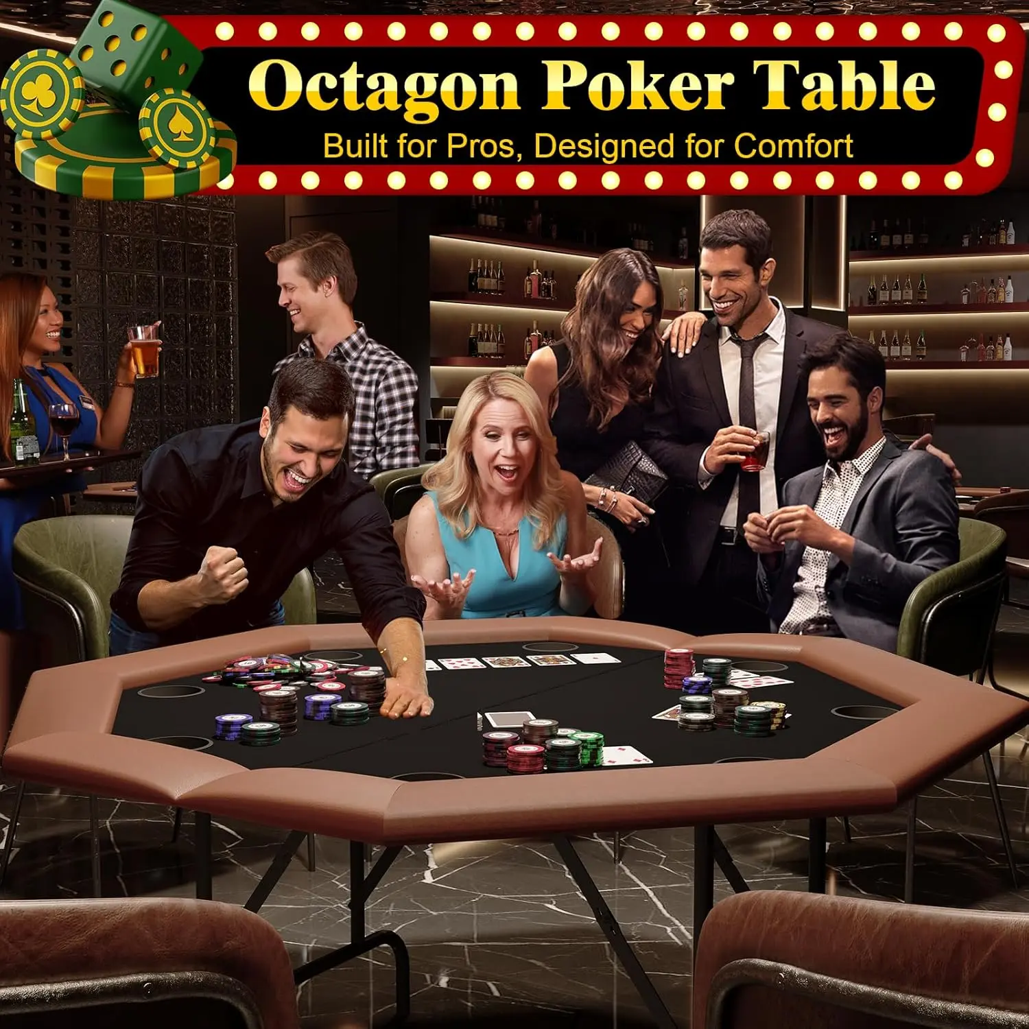 SPACIOUS 8-PERSON GAMING SURFACE: Designed with an expansive octagonal layout, this premium poker table comfortably seats up to eight players, making it ideal for lively game nights or friendly tournaments. Its generous playing area ensures ample space for cards, chips, and hands, creating an engaging atmosphere perfect for social gatherings.