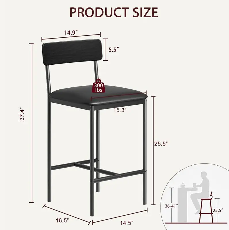 EASY TO ASSEMBLE AND MAINTAIN: All the assembly hardware and tools come with this counter height bar stools. With illustrated instructions, these rustic kitchen bar chairs can be assembled within 20 min without effort. Dimensions: 16.5” L x 15.3” W x 37.4” H.