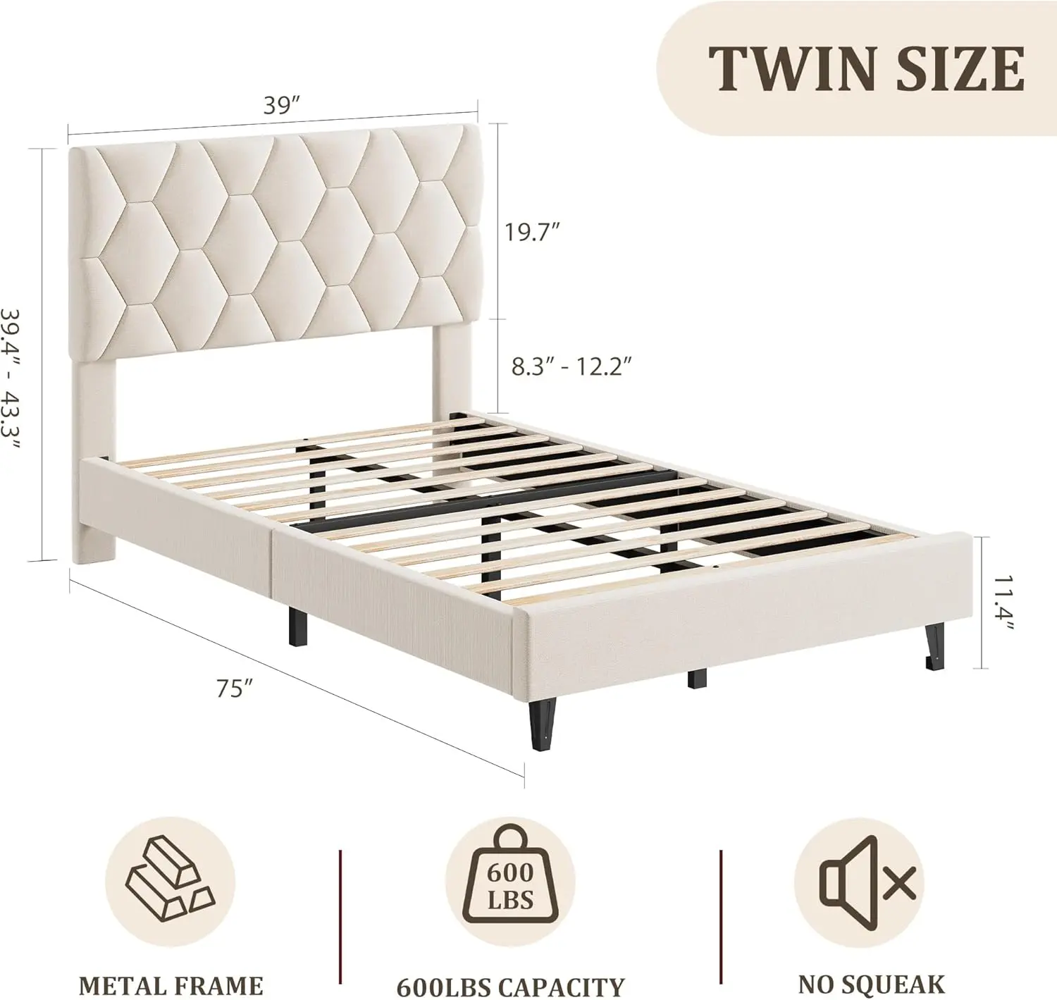 【Sturdy & Durable Construction】: This beige twin size bed is expertly crafted from high-quality metal and wood, featuring 12 durable wooden slats and a tightly padded foam frame. It supports up to 600 pounds, providing excellent stability. Additionally, the heavy-duty legs are equipped with round plastic caps to protect your floors from scratches