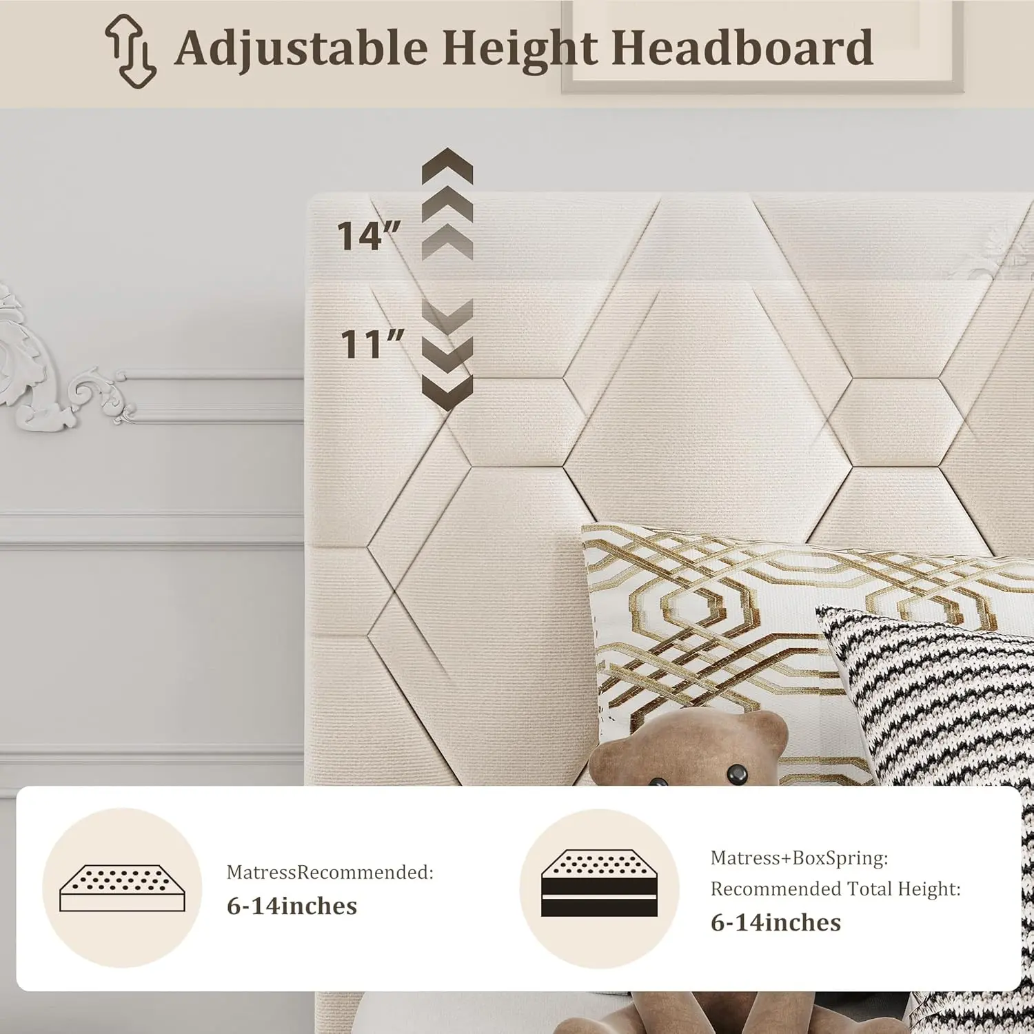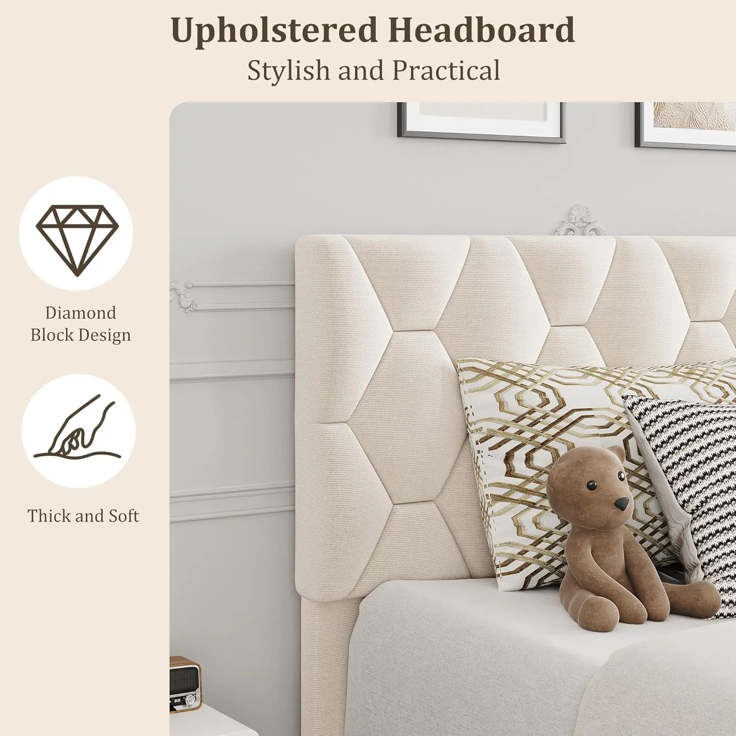【Modern Elegance】: Featuring a diamond block design on the headboard, the upholstered bed frame combines contemporary style with plush comfort. And wide headboard not only adds comfort but also completes your contemporary aesthetic. Its foam-padded upholstery offers supportive comfort while relaxing