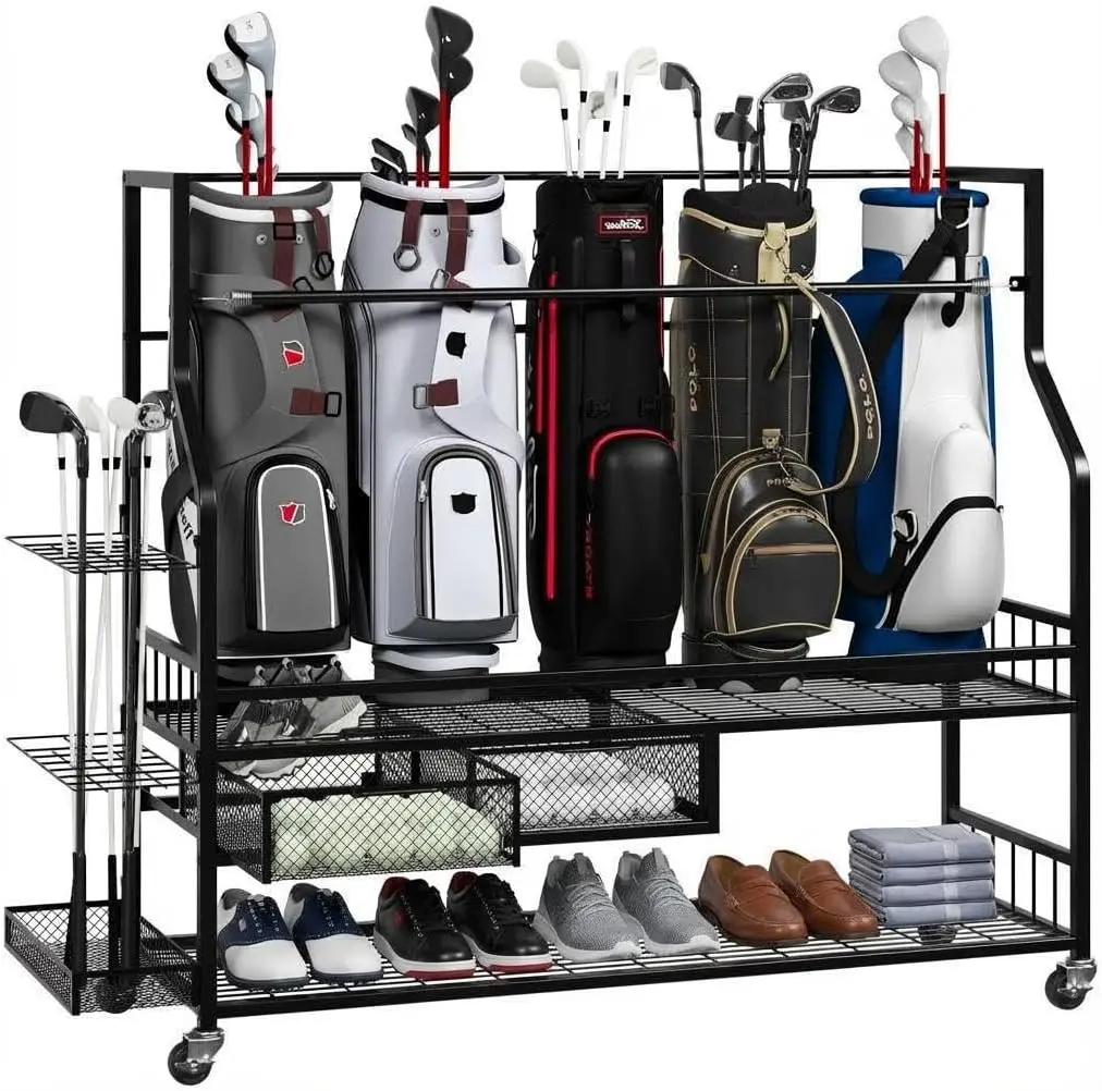 ·1. Ample 3-Bag Capacity & Convenient Drawer Maximize your storage with this all in one golf bag rack, designed to neatly hold up to 3 golf bags and 24 clubs. The added top drawer offers a dedicated, easily accessible space for essentials like balls, tees, and brushes, ensuring everything has its place for a streamlined experience.