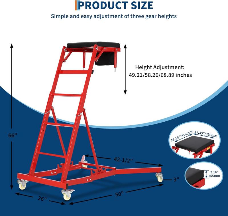 ·[PRO-LEVEL COMFORT PADDING] A 2" thick, workshop‑grade cushion with an extra‑wide 15" x 16" surface supports your chest and elbows while you lean over the vehicle. The shock‑absorbing design reduces pressure points and fatigue, helping you stay comfortable and focused through longer maintenance and detailing tasks.