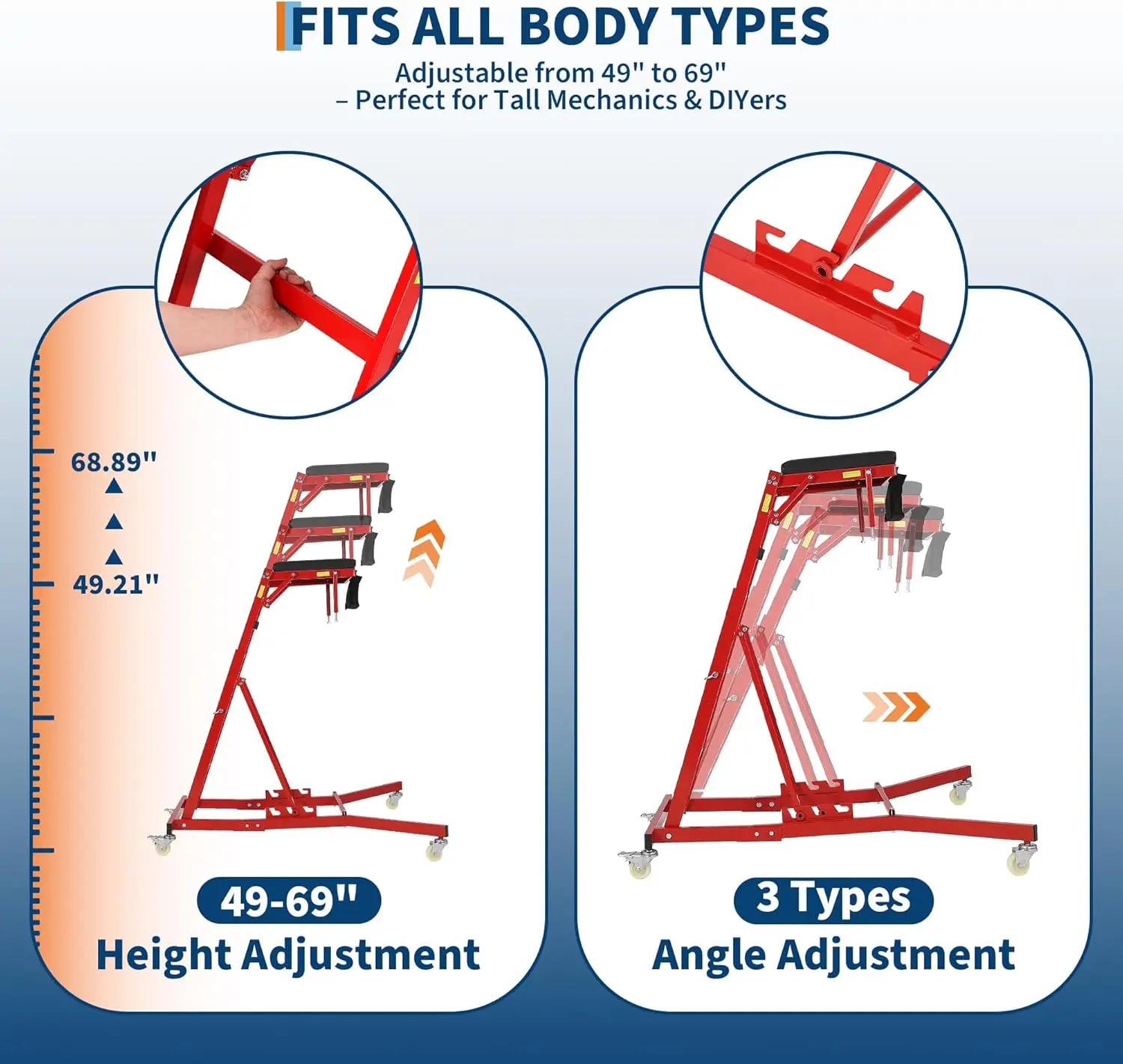·[FULLY ADJUSTABLE REACH & ANGLE] Dial in your perfect working position with 9 length settings from 49.2" to 68.9" and a 3‑position angle system. Easily adapt from compact sedans to lifted trucks so you can reach deep into the engine bay or over tall fenders without overextending, straining, or constant repositioning.