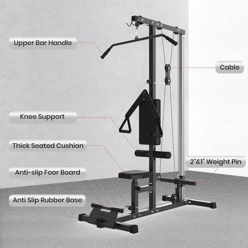 ADJUSTABLE SEAT & KNEE SUPPORT: Both the seat and the high and low pulley stations of this cable machine can be adjusted to three different positions to accommodate different heights and lock you in position for an effective high pulley lat exercise. In addition, the large footrest provides stronger support during seated rowing.