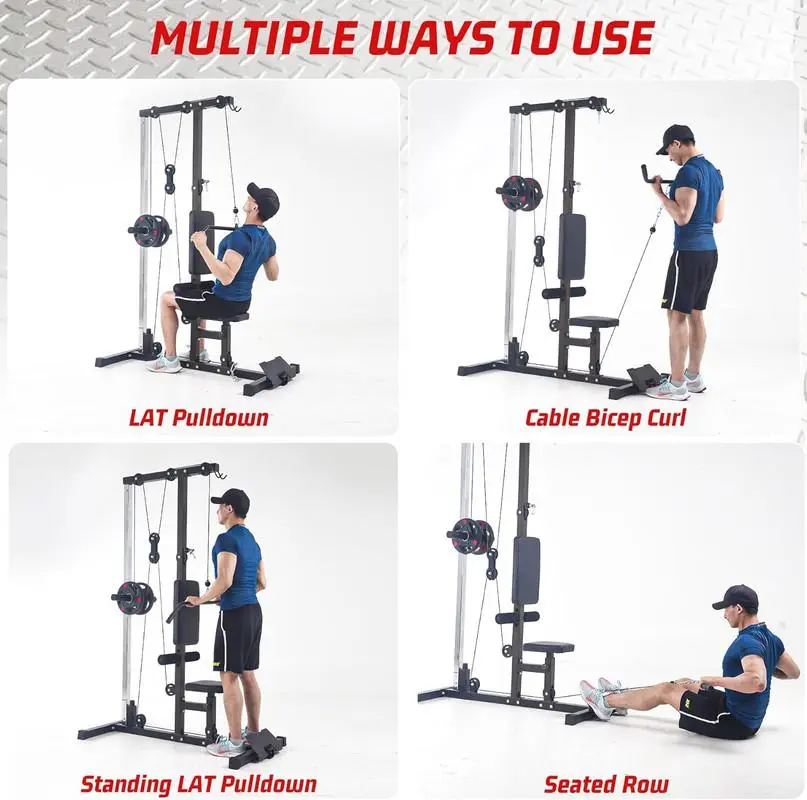 VERSATILE PULLEY CABLE SYSTEM: This lat pulldown machine comes with a lat bar and a cable bar to meet a variety of training needs. Equipped with a high and low adjustable pulley system, it provides a variety of training methods such as seated rowing, standing pulldowns, and bicep curls. It is ideal for exercising biceps, forearms, shoulders, trapezius, triceps, and more muscle groups.
