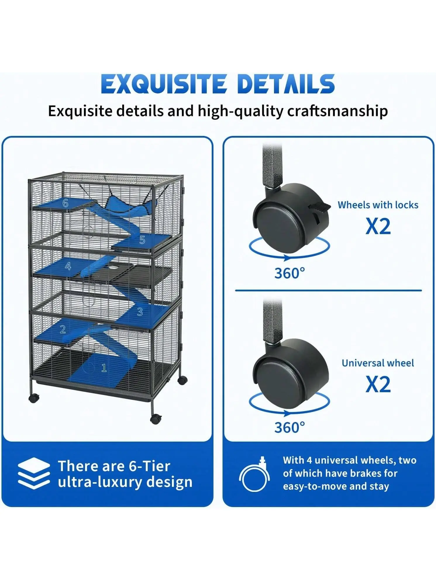Metal Small Animal Cage 6-Tier Ferret Sugar Glider Cage For Chinchillas/Guinea Pig/Rabbit/Large Hamste Rolling Critter Nation Cage With Flannel Ramps, Removable Tray,6 Doors Easy Clean Metal Mink Cage Suitable For Hamsters,