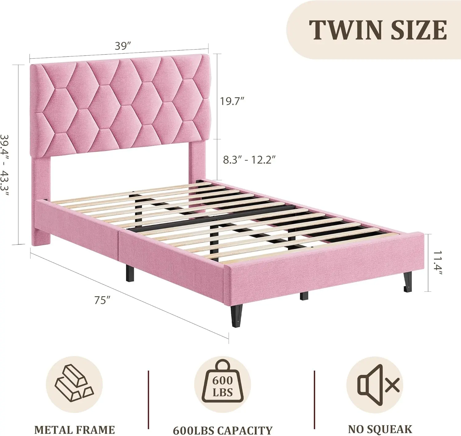 【Sturdy & Durable Construction】: This beige twin size bed is expertly crafted from high-quality metal and wood, featuring 12 durable wooden slats and a tightly padded foam frame. It supports up to 600 pounds, providing excellent stability. Additionally, the heavy-duty legs are equipped with round plastic caps to protect your floors from scratches.