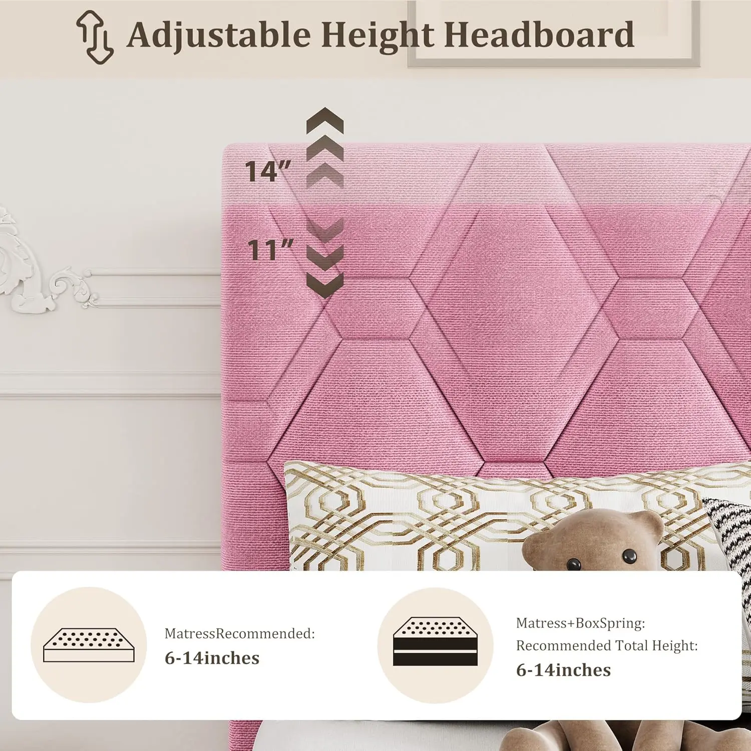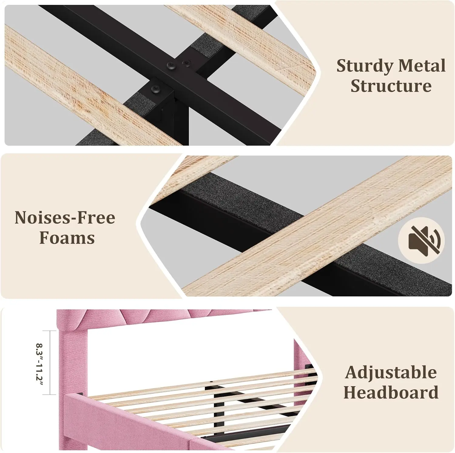【Adjustable Headboard】: Adjustable upholstered headboard ensures a fully connection with the mattress, which is more stronger and can prevent your mobile phone or other small things falling down to the floor.Fit perfectly for a mattress of 8.3-12.2 inches.