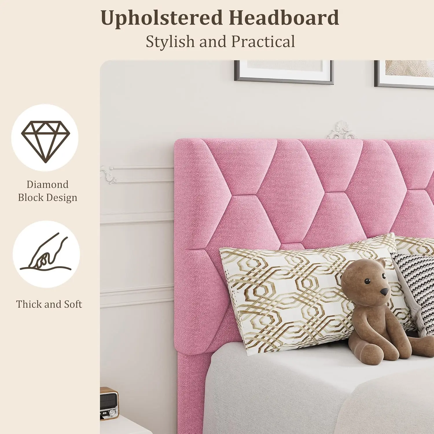 【Modern Elegance】: Featuring a diamond block design on the headboard, the upholstered bed frame combines contemporary style with plush comfort. And wide headboard not only adds comfort but also completes your contemporary aesthetic. Its foam-padded upholstery offers supportive comfort while relaxing
