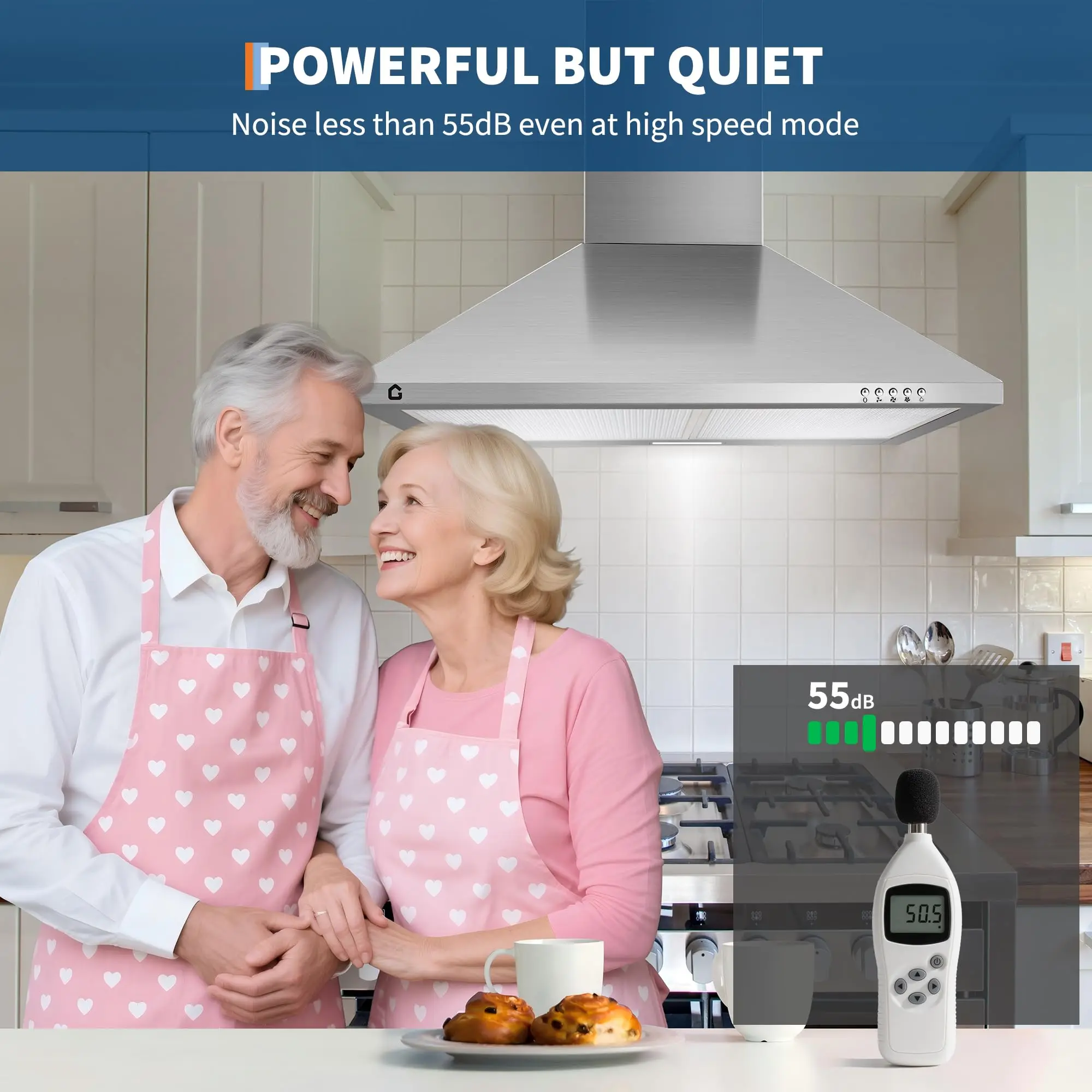 Crafted from high-quality stainless steel, this range hood not only looks sleek and modern but also stands up to the rigors of daily kitchen use. The LED light and button control panel add a touch of sophistication and make cooking tasks easier by providing clear Lighting and intuitive controls.