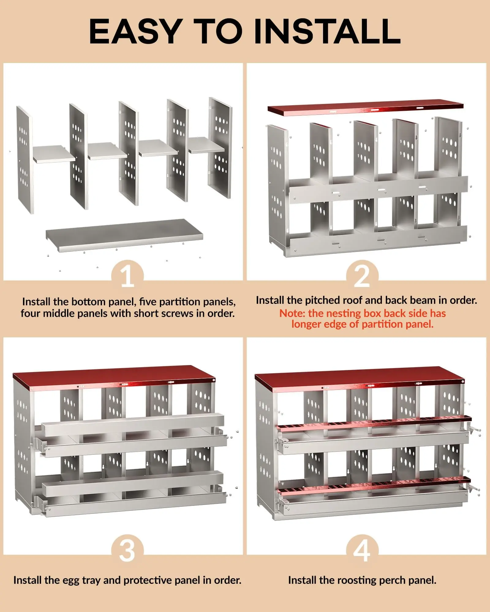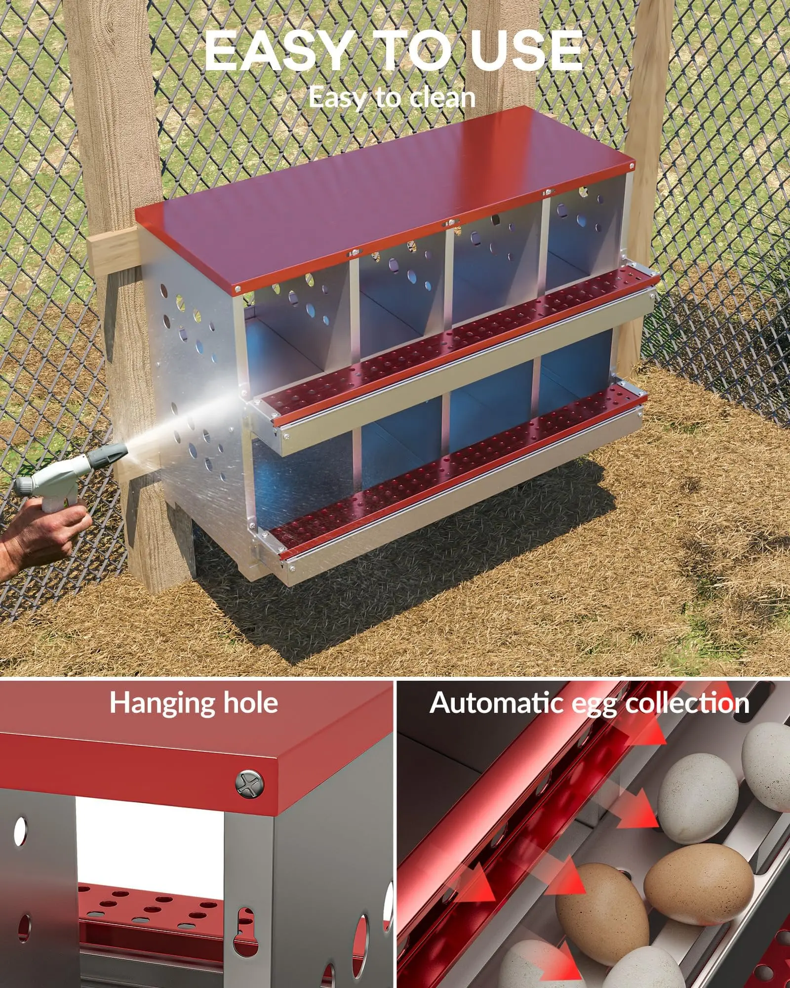 【Comfortable Nesting Environment】 The chicken nesting box enhances egg production by providing a spacious, welcoming retreat complete with plastic guide eggs to help hens settle into their new home; features built-in hanging holes for wall mounting the nesting box 18–20 in above the floor and an integrated perch so hens can survey their surroundings and regulate body heat. 【Automatic Egg Collection】 Streamline egg gathering with the roll-away nesting system. Eggs roll away from the nest on a gently sloped floor into the front-mounted collection tray. An overhead protective panel can also prevent hens from pecking the eggs, drastically reducing breakage, mess, and manual collection effort 【Designed for Lasting】 Constructed from hot-dip galvanized steel with a waterproof, rustproof finish, this nesting box is engineered to withstand demanding barn environments and deliver years of dependable performance 【Easy to Clean】 The roll-out nesting box is engineered for effortless maintenance: a quick rinse removes debris while the sloped roof channels runoff and the removable bottom grate plus side ventilation holes promote faster drying for consistently fresh nesting quarters 【Quick Installation】 Every laying box ships with all necessary screws, nuts, and a clear, step-by-step instruction guide for a complete setup in about 30 minutes; our expert support team stands by to assist with any questions