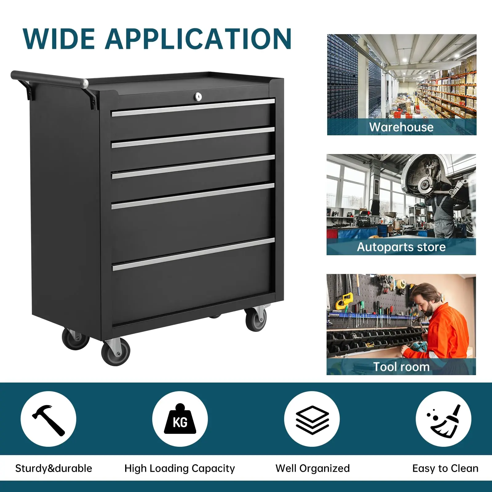【Industrial-Grade Build】Engineered with heavy-gauge steel construction, this full-size rolling tool cabinet delivers unwavering resilience for demanding workspaces. The advanced powder-coated finish repels oil stains and resists scratches, maintaining a professional appearance through years of daily use. Reinforced corner joints and seamless welds provide unparalleled structural integrity that withstands rigorous workshop environments.