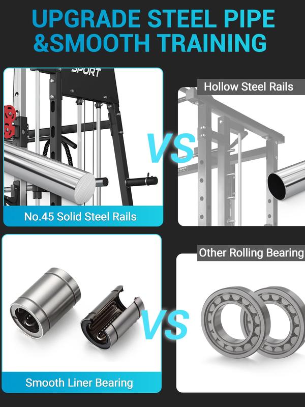 【Smooth Cable & Smith Bar System】Equipped with PU-coated cables, precision pulleys, and solid steel guide rails for quiet, fluid movement. Features 15 adjustable height positions to support a wide range of workouts including lat pulldowns, rows, curls, presses, and flys.