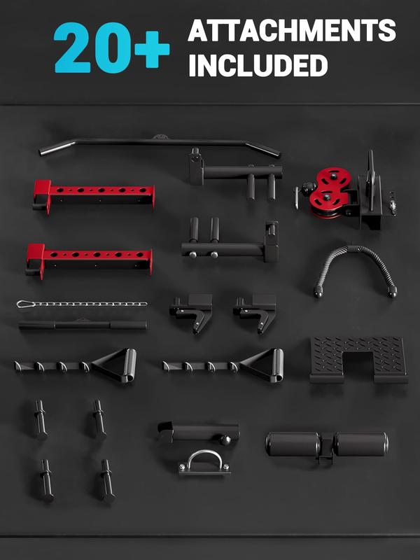 【All in One Home Gym Station】This machine combines a Smith bar, squat rack, power cage, pull-up station, and cable crossover in one compact design. With 4 band pegs included, it supports strength, endurance, and resistance training—covering chest, back, legs, arms, and core.