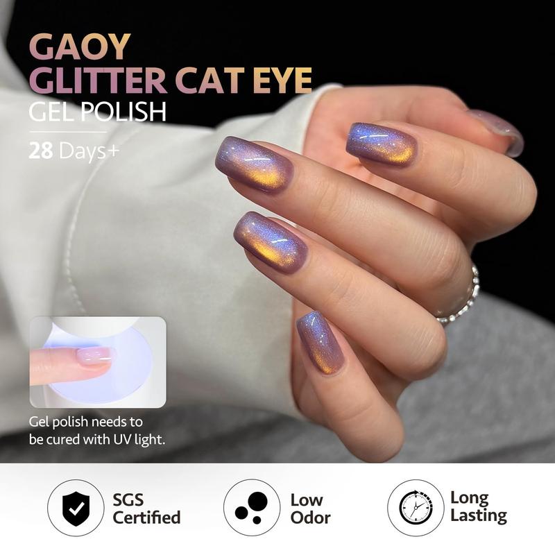 Beautiful gel colors! 6 cat eyes come with standard magnet. Highly pigmented metallic glitters shift and sparkle when activated. 60 second cure in nail lamp. Applied over black base for most intense color payoff.