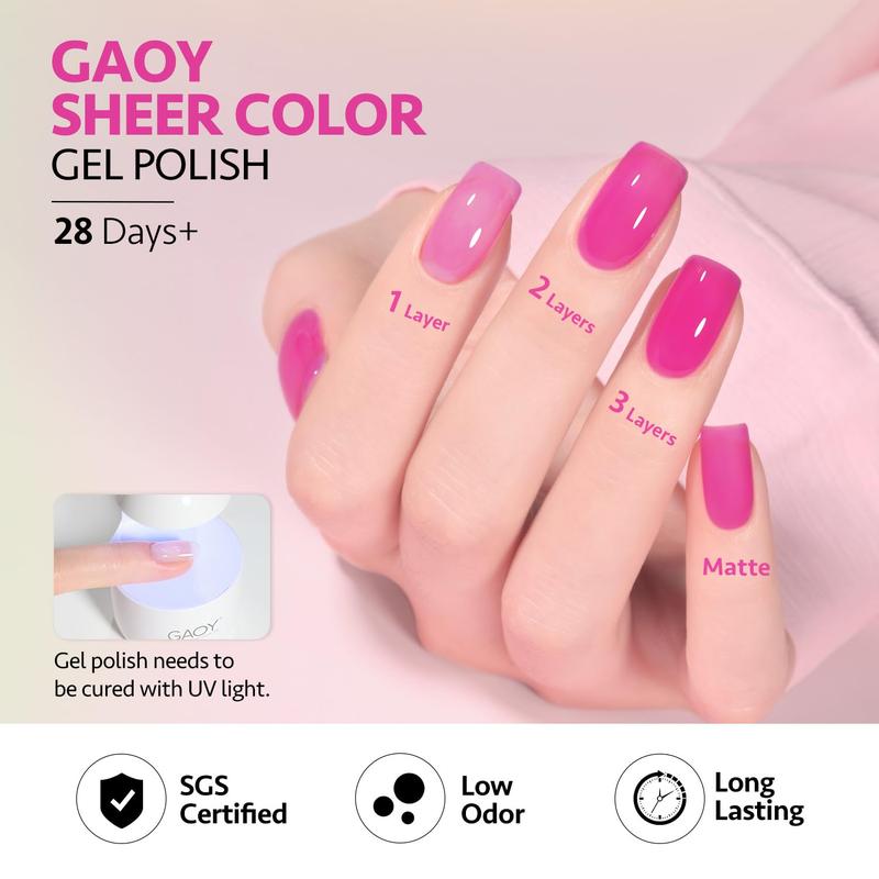 Sheer Gel Polish: Apply several layers to build up the color from clear translucent to solid opaque.