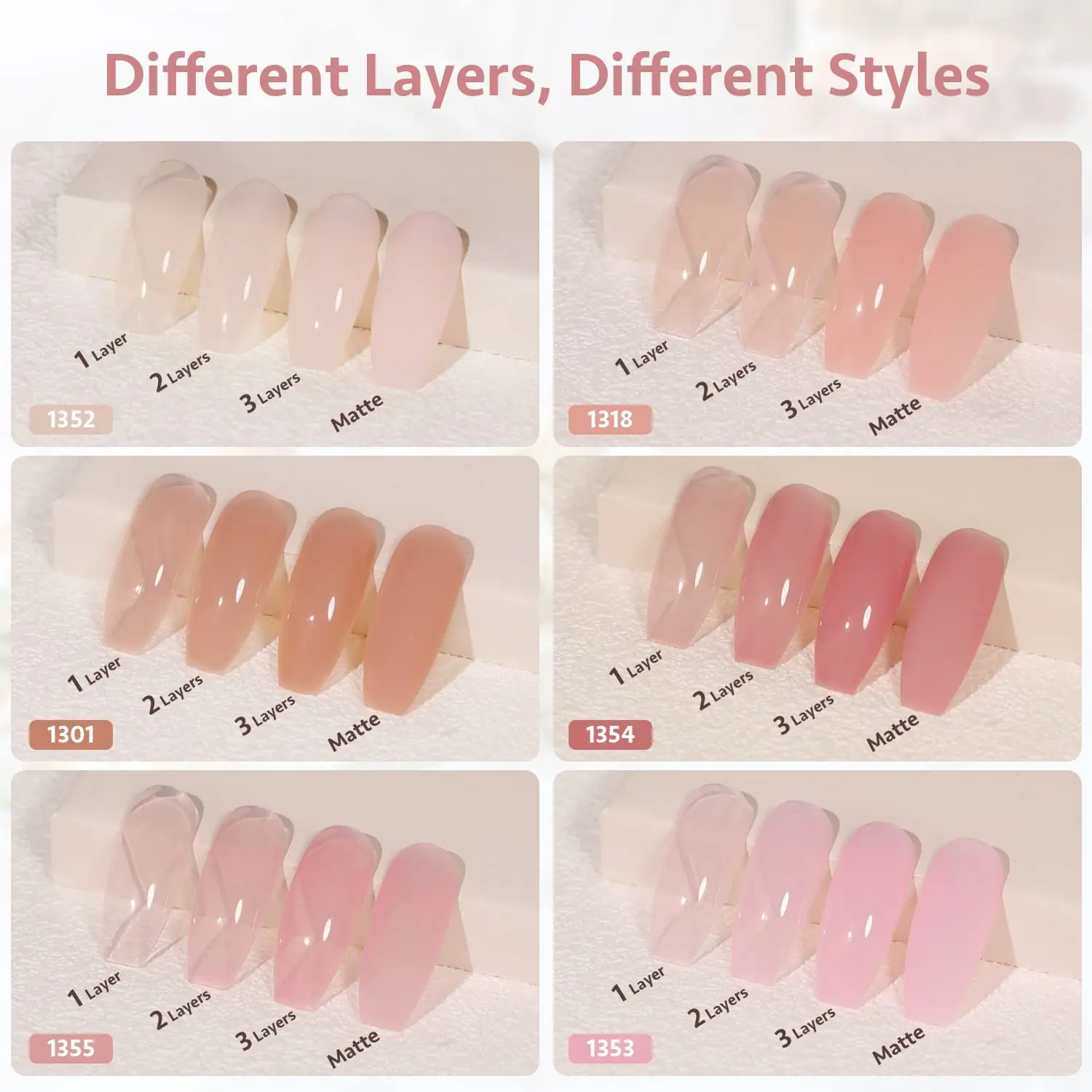 Sheer Gel Polish: Apply several layers to build up the color from clear translucent to solid opaque.