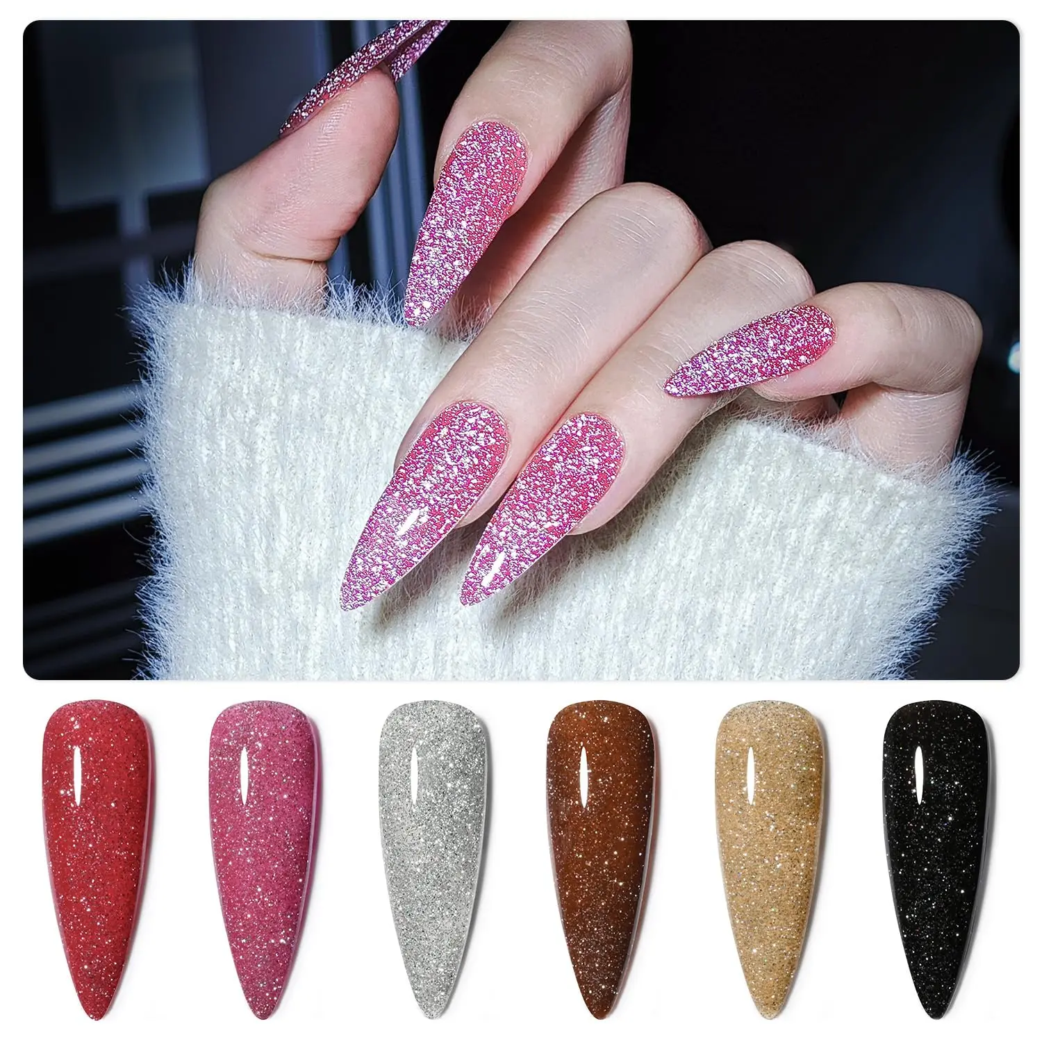 GAOY Salute Reflective Glitter Gel Nail Polish Set of 6 Colors Including Pink Red Silver Black Colors Holographic Gel Polish Kit for Salon Gel Manicure and Nail Art DIY at Home