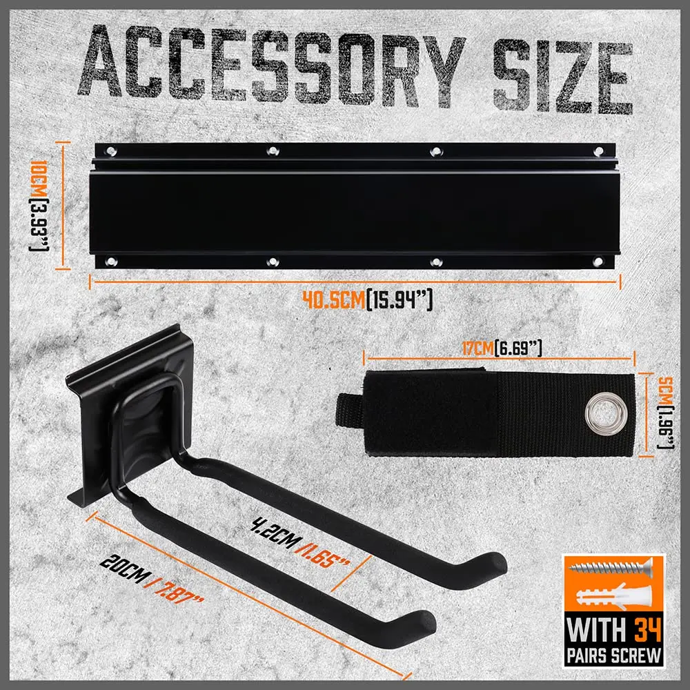 ·Package Come with 4pcs Steel wall racks(Each 16 inch), 9 pcs Heavy double hooks(7.8 inch) and Installation accessories.