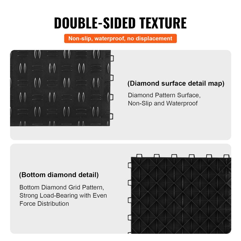 ⢠Waterproof and Easy to Clean: Featuring a 3D diamond-textured surface and rhombic grid bottom layer, the interlocking garage tiles effortlessly handle water stains and spills. Regular mopping and vacuuming maintain cleanliness.