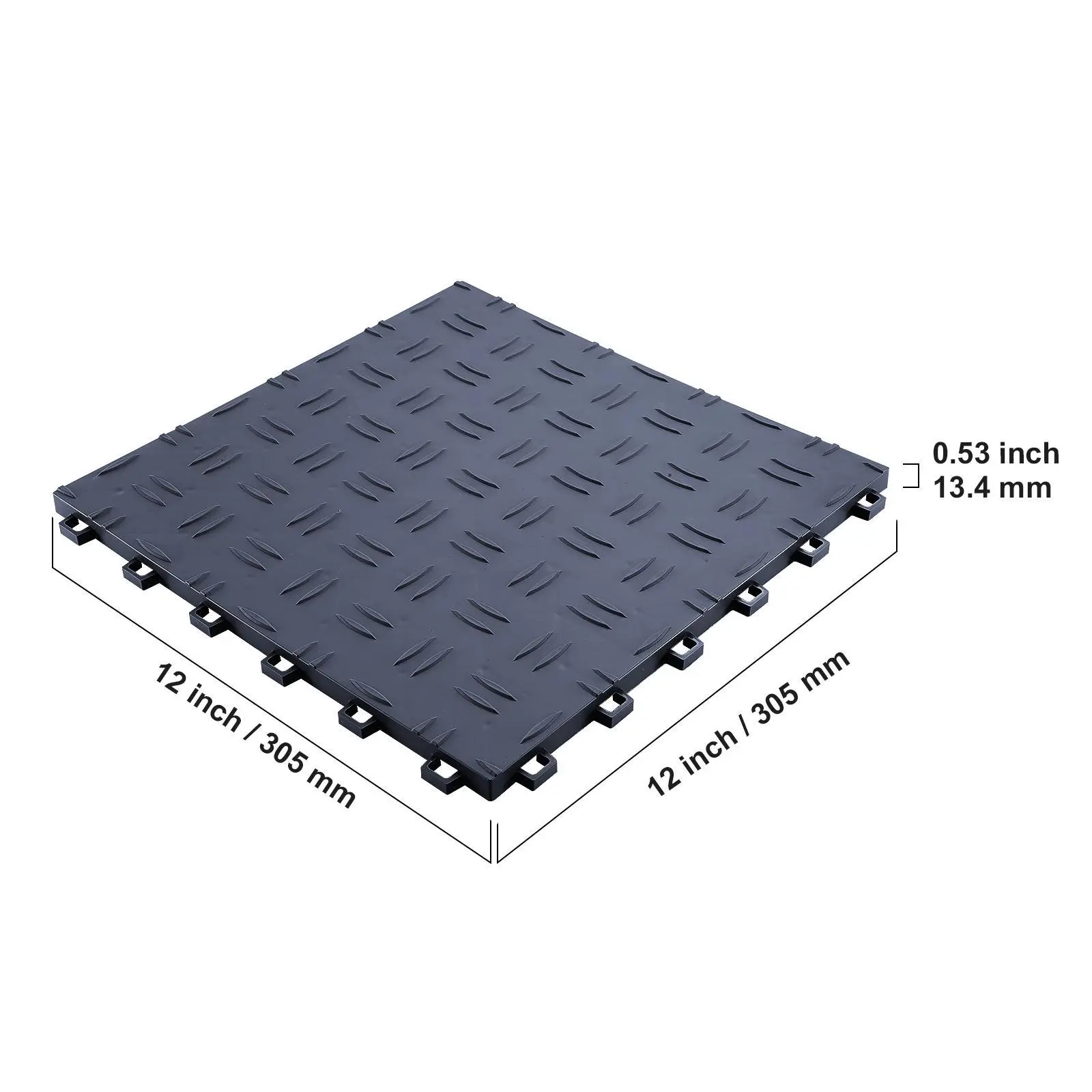 • Waterproof and Easy to Clean: Featuring a 3D diamond-textured surface and rhombic grid bottom layer, the interlocking garage tiles effortlessly handle water stains and spills. Regular mopping and vacuuming maintain cleanliness.