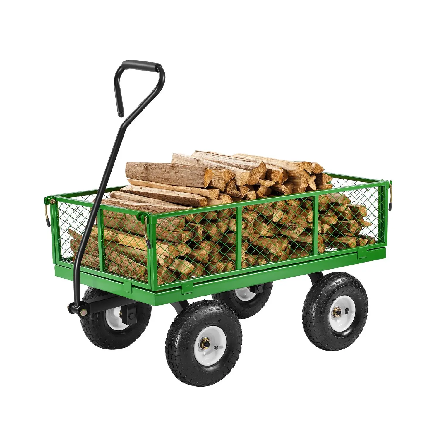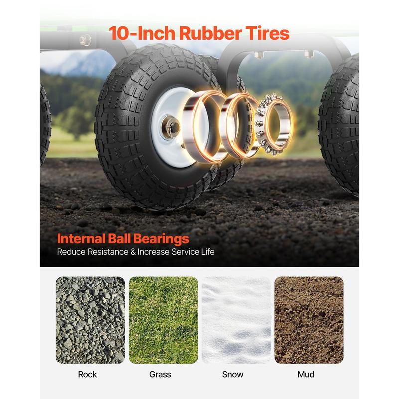 • 360° Rotating Wheels: Equipped with 10-inch rubber tires and metal hubs, the wheels of this heavy duty steel garden cart ensure smooth movement across various terrains, including grass, mud, rocks, and snow. Its sturdy design provides stability while reducing the effort required for transport.