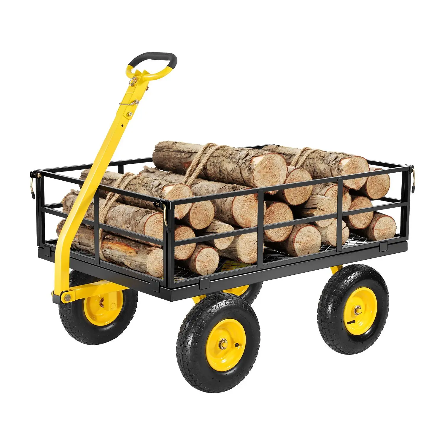 • 360° Rotating Wheels: This yard cart features 13-inch rubber tires with sturdy metal hubs that provide smooth mobility on grass, mud, rocks, and snow. Its robust design ensures stability across various terrains, making your outdoor transport tasks effortless.