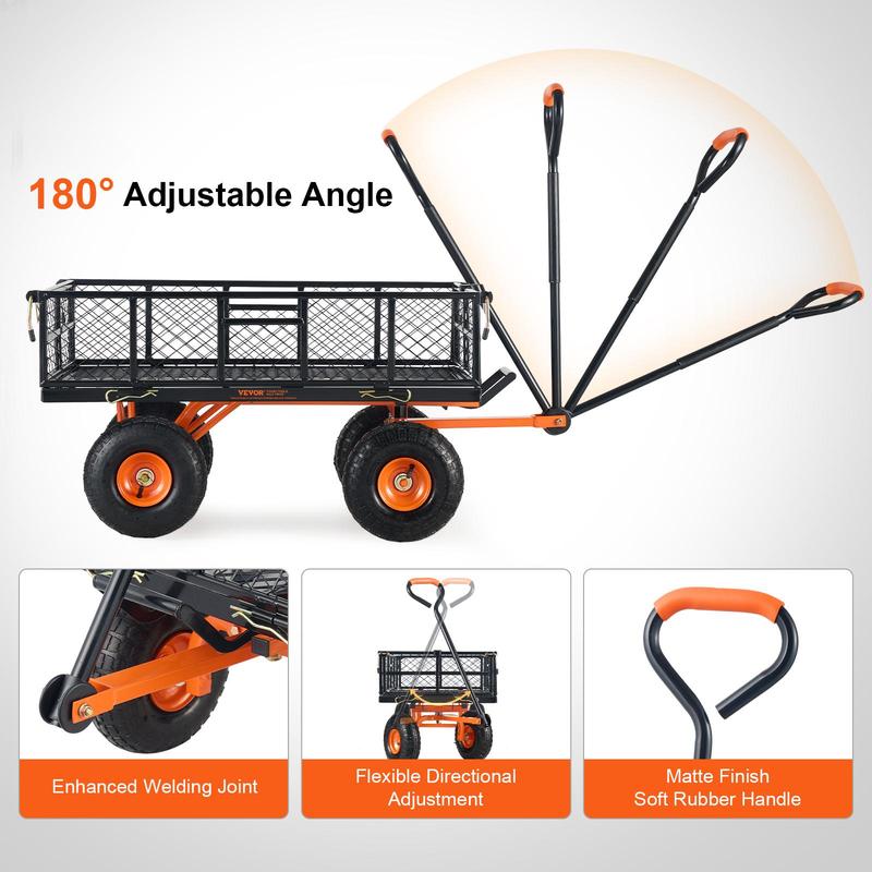 • Easy Dumping: Equipped with a front-handle dumping frame, users can quickly unload items. Simply disassemble the bottom of the frame to the garden dump cart. The 180° adjustable handle facilitates effortless maneuvering, doubling your efficiency.