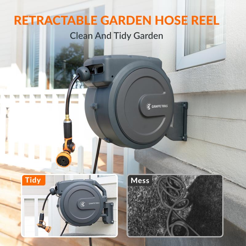 A wall-mounted retractable hose reel provides you with a one-stop watering service. Always prepared to use it anywhere, anytime.