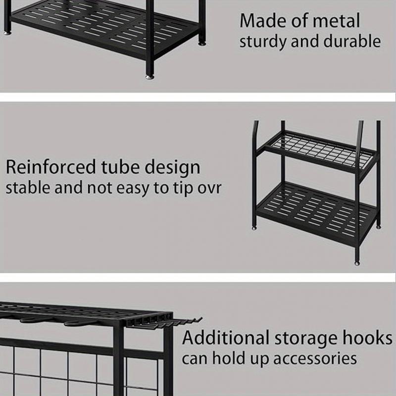 Shade: Dark. Material of Frame: Durable Metal Pipe. Measurements: 35"W x 18"D x 66"H. Mass: Easy to handle at just 7 lbs. Our strengths include a unique supply chain system that guarantees the quality of our products. Before packaging and shipping, we verify the qualification rate of each item. We offer 19 hooks and over 50 varieties of tool storage racks.