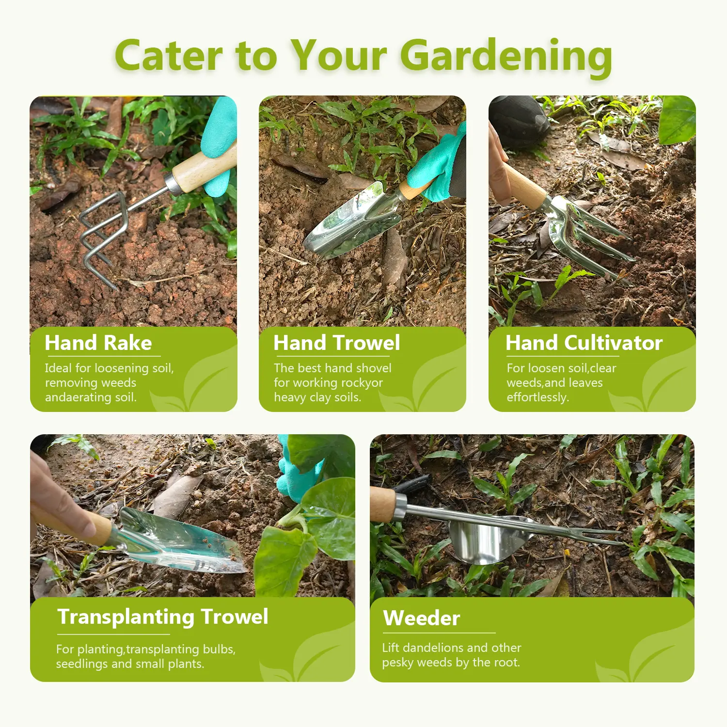 ·Durable Stainless Steel Garden Tools - Heavy-duty stainless steel heads can withstand the toughest roots, rocks, and soil, sturdier than cast aluminum/coated/carbon steel, No need to worry about rusting and breaking during pruning, digging, weeding, etc. Mirror-polished process to make the tool get the minimal soil adhesion and easier cleaning.