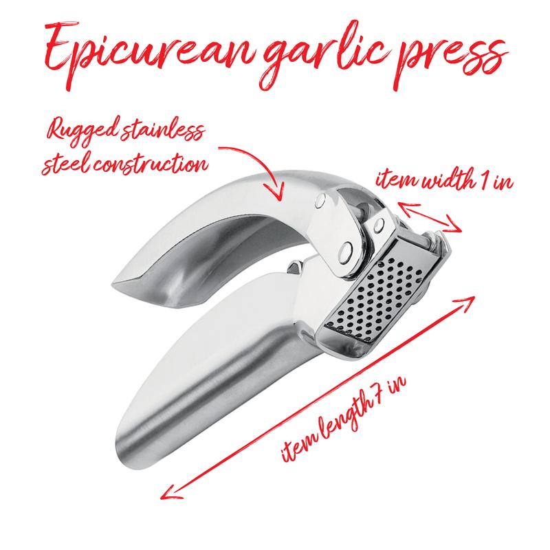 Kuhn Rikon Epicurean Garlic Press Stainless Steel 6.5 x 1 x 1.5 inches Silver Ergonomic Handles Bevelled Holes Dishwasher Safe Kitchen Utensil