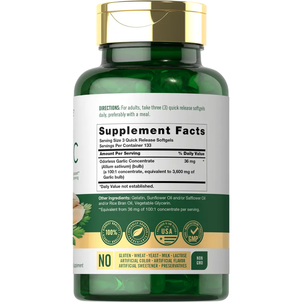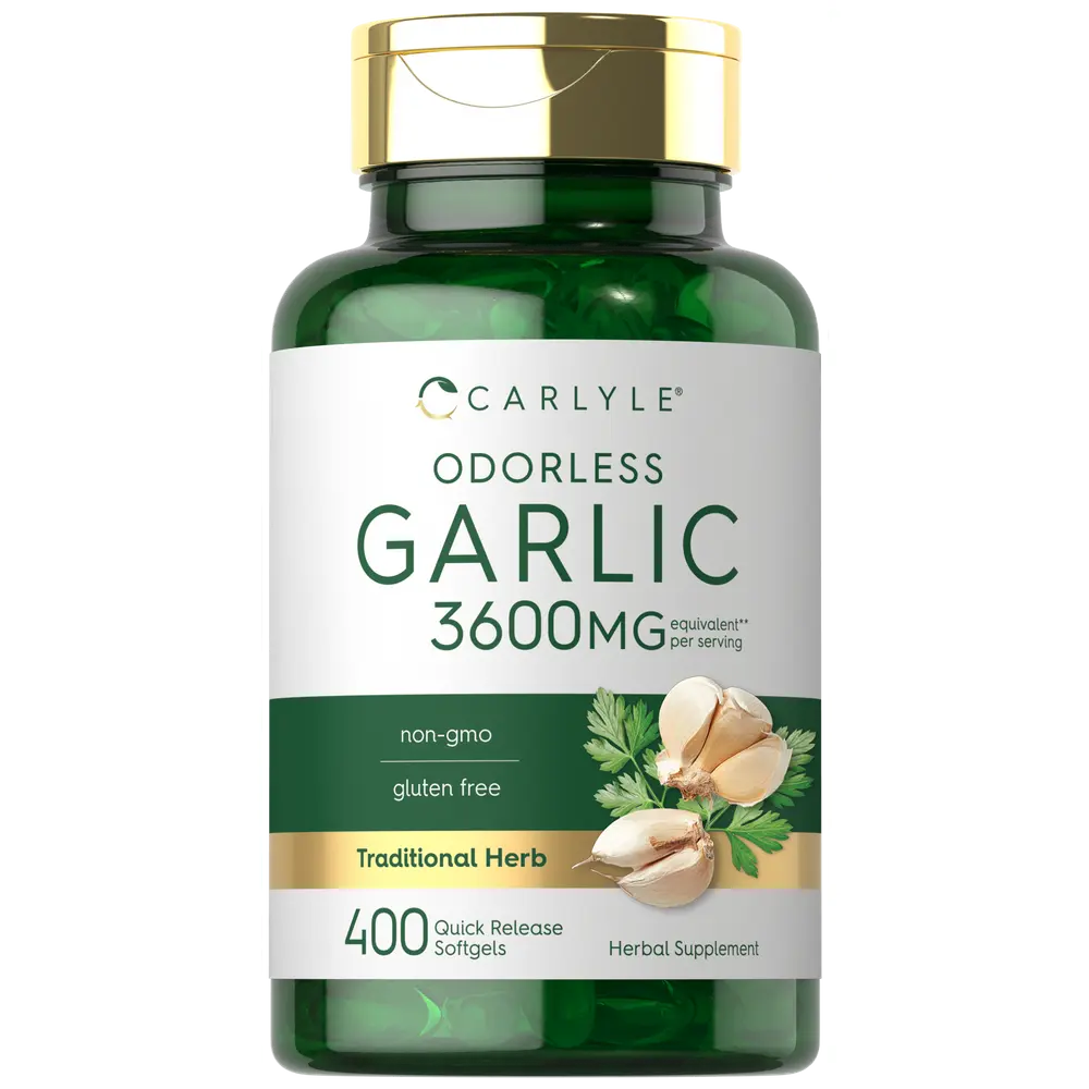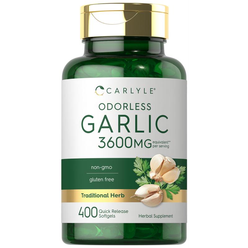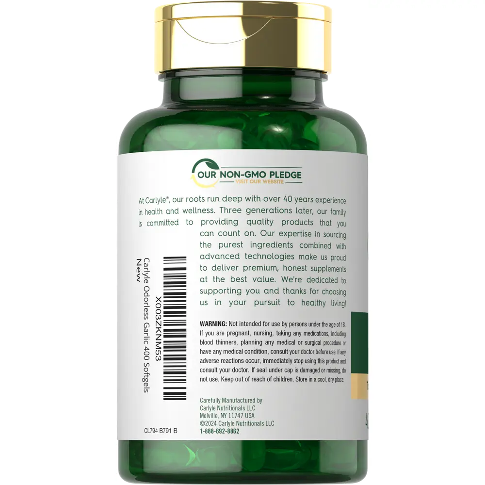 Carlyle Odorless Garlic is made from a premium source of fresh garlic, designed to bring you the benefits without any odor! Our gluten free and non-GMO formula features the equivalent of 3,600 mg of Garlic per serving in quick release softgels.** It's free of artificial flavor, sweetener, and preservatives, delivering the exceptional quality men and women deserve for their daily routine. Enjoy our 400-count softgel supply today!