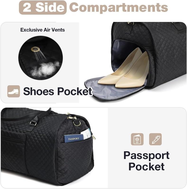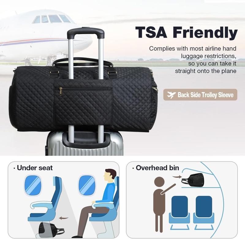 ·【2 in 1 Convertible Weekender Bag】With the fancy design of combining the features of garment bags and duffel bag for women, such as hanging clothes (placed with suit, skirt, evening dress), various internal pockets and large capacity (placed with shoes, toiletries, cosmetics and electronic devices, etc.)