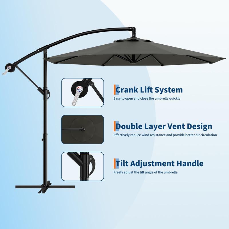 · 【Versatile & Stylish for Multiple Settings】Our 10ft Cantilever Umbrella provides ample shade, making it ideal for patio tables, gardens, decks, backyards, poolside areas, and outdoor cafes. The modern design complements any outdoor décor, ensuring a stylish and functional addition to your space.