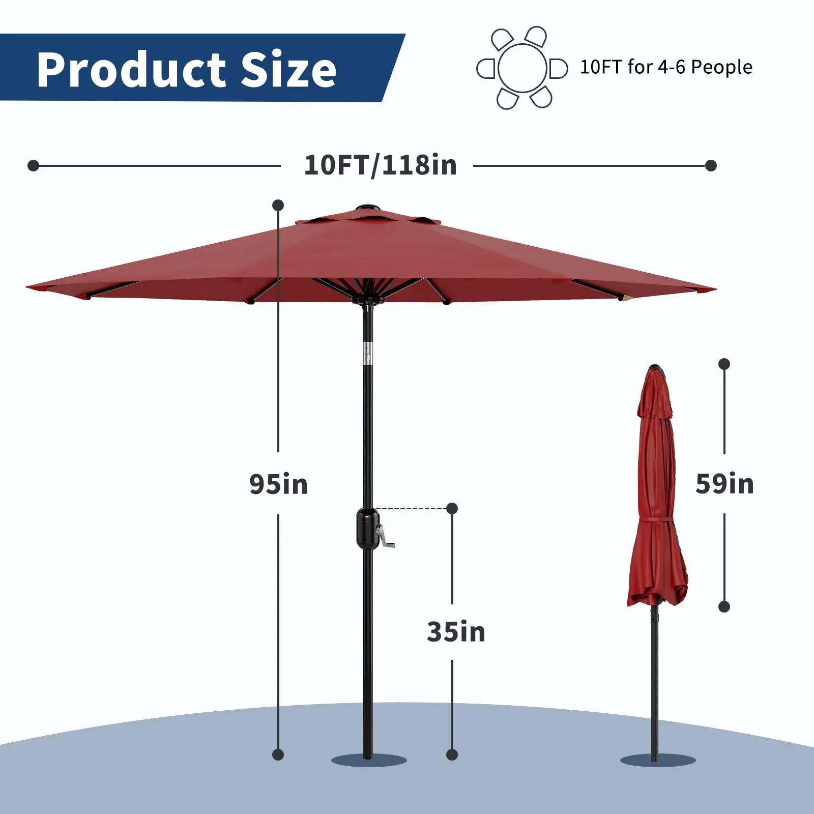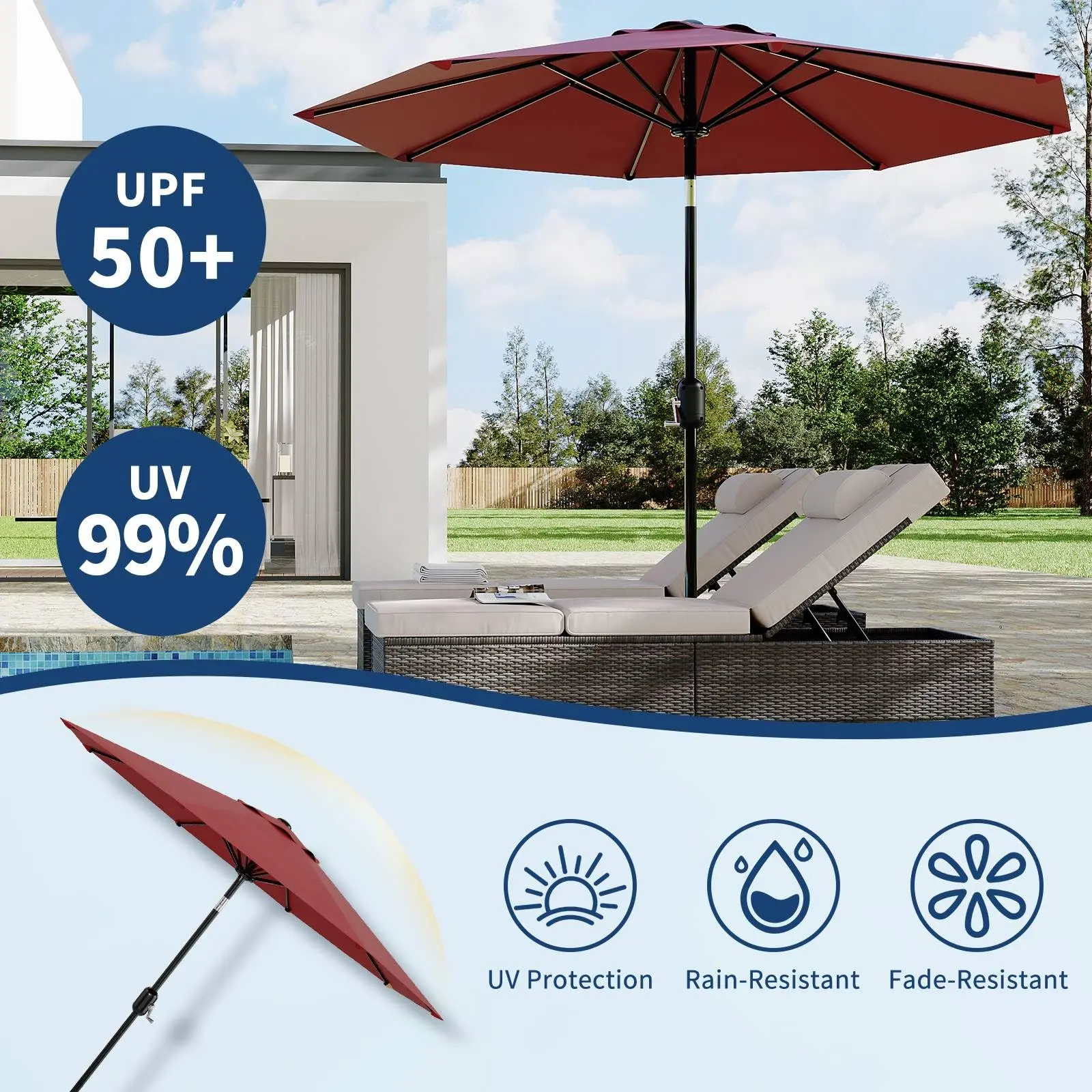 · 【High-Quality Fabric】Our 10ft patio umbrella is crafted from premium polyester fabric, offering superior UV protection and water resistance. Easy wiping after rain reduces cleaning burden, ensuring long-lasting vibrant colors that keep your umbrella outdoor patio looking fresh and stylish for long time.